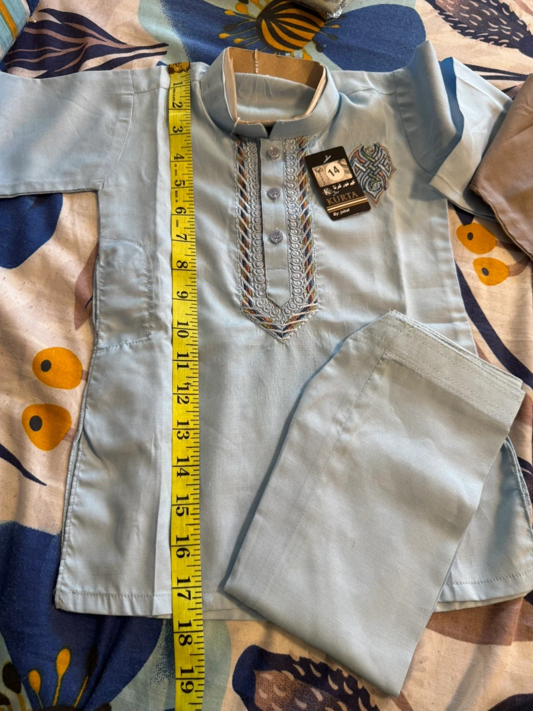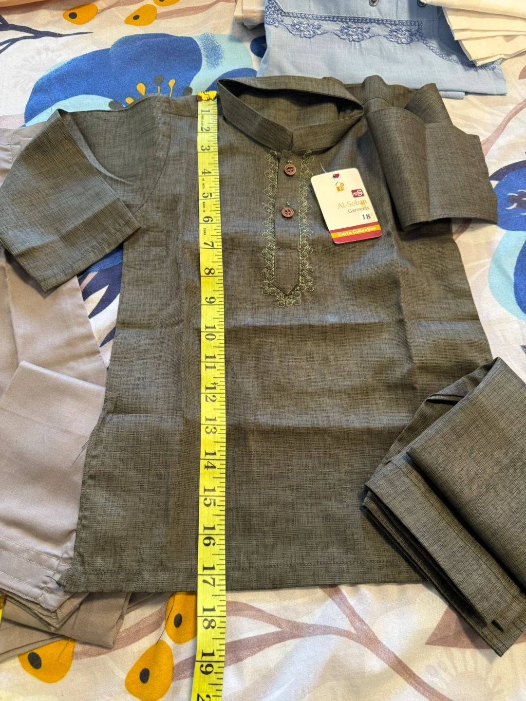Three boys' kurta pajama sets are available in light blue, taupe, and dark grey. Each set features embroidered detailing and matching pants. Sizes 14 and 18 visible.