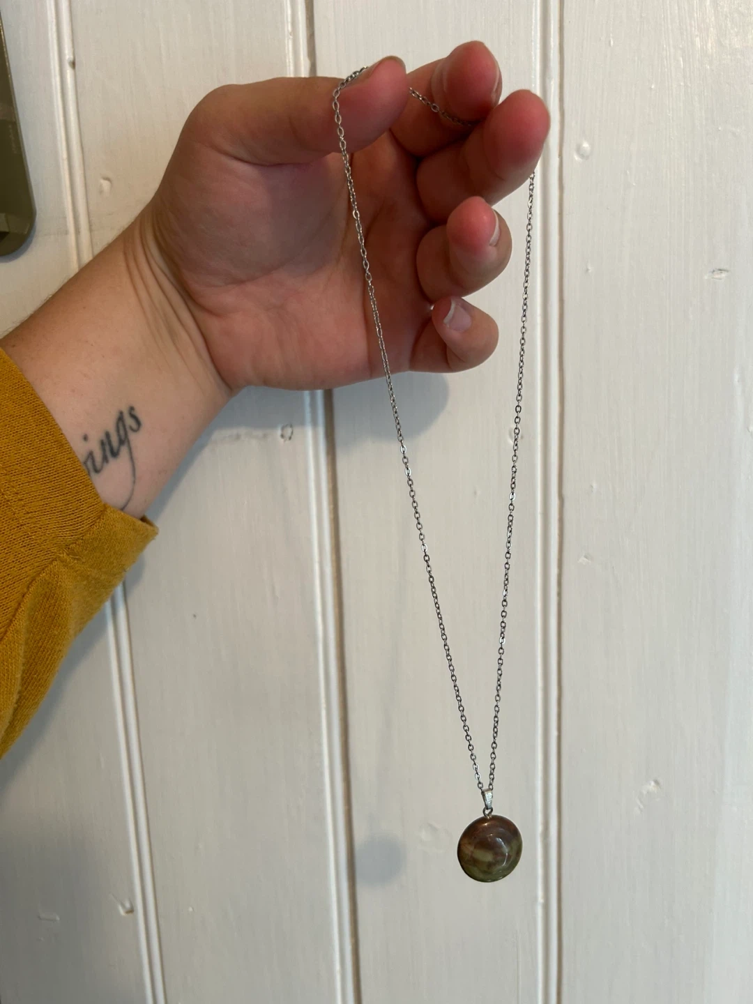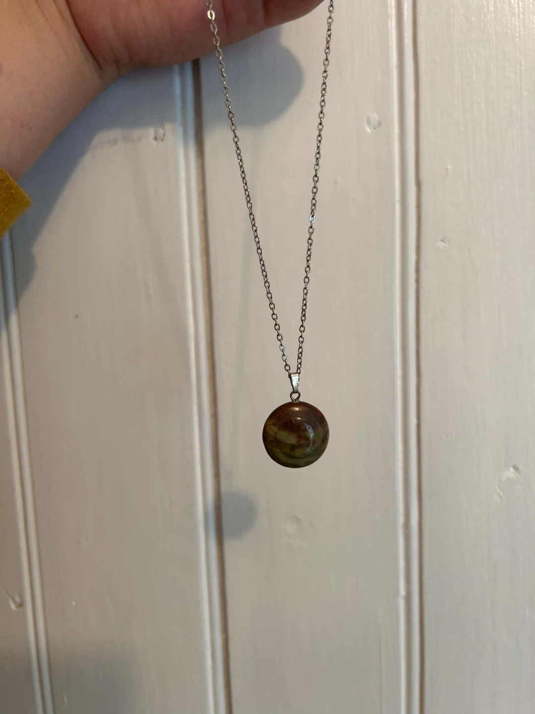 12Handmade by local small shop, Kitty r designs. Green & brown circle gemstone necklace. Brand new $10 Pickup between kincardine & ripley or I can arrange delivery in port Elgin-Owen sound, walkerton-Durham, wingham-listowel-kw/cambridge, goderich-bayfield, Woodstock & Arthur-Orangeville-Newmarket-Lindsay-Peterborough AREAS.