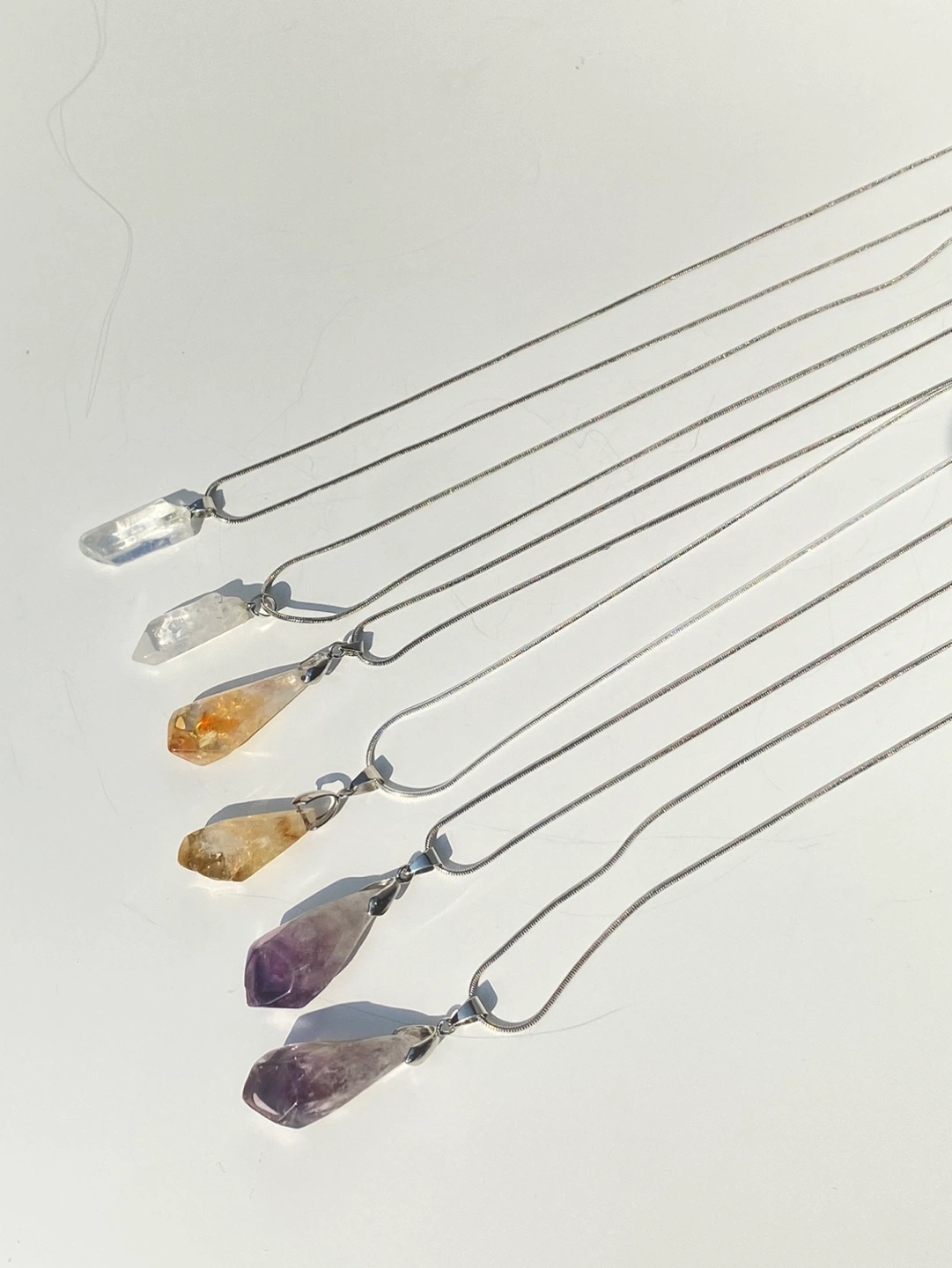 31$17 each Brand new in gift wrap! Sterling silver plated Chain 18” with your choice of gemstone pendant Clear Quartz Heated citrine Amethyst root