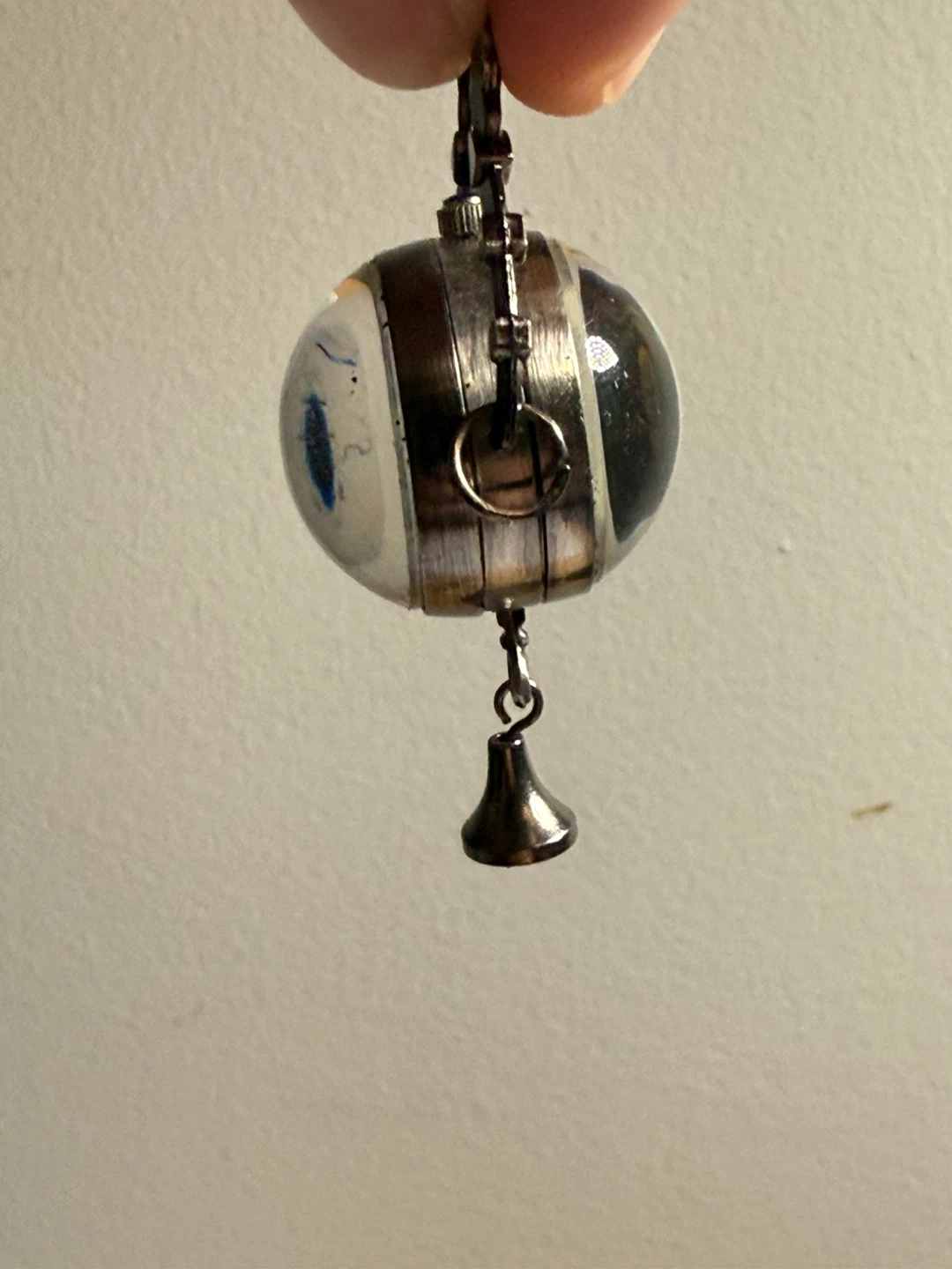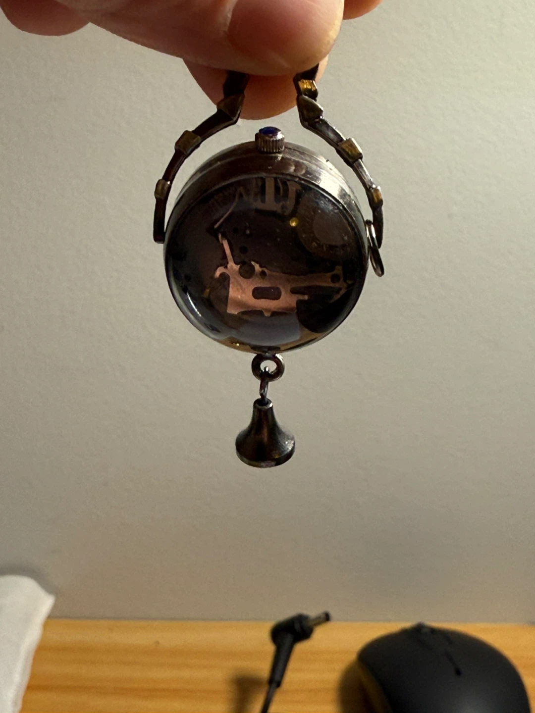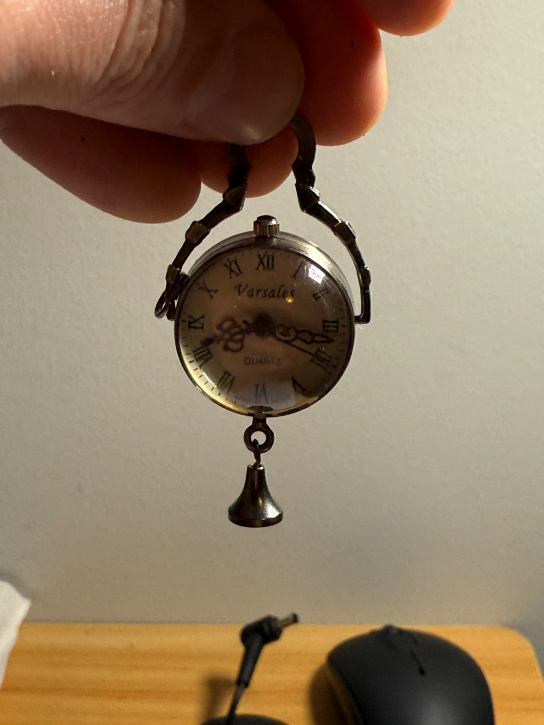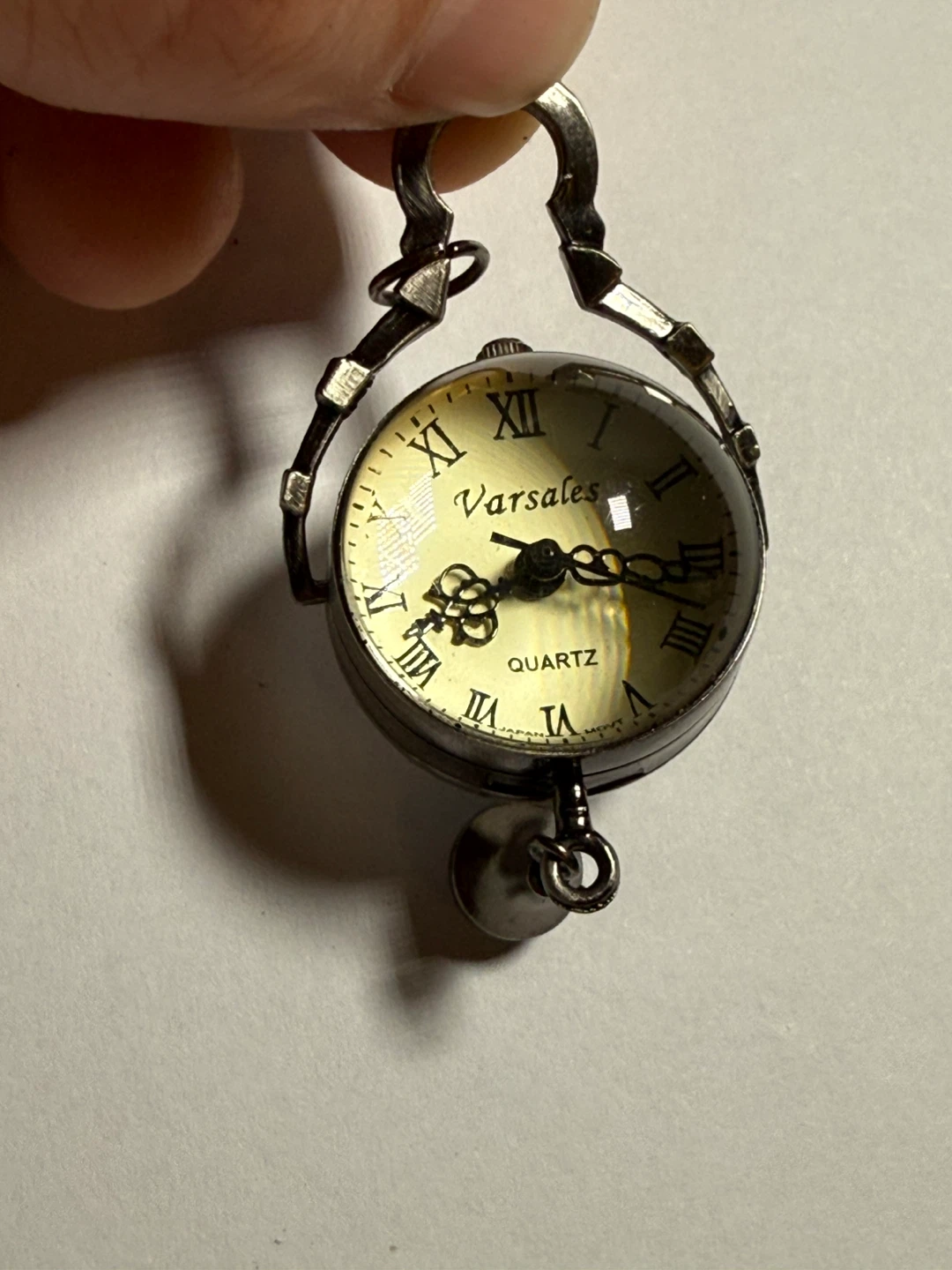 This is a unique Varsales quartz pendant watch with a clear orb casing. It features Roman numerals and a decorative bell charm. It's a distinctive accessory for any collector.