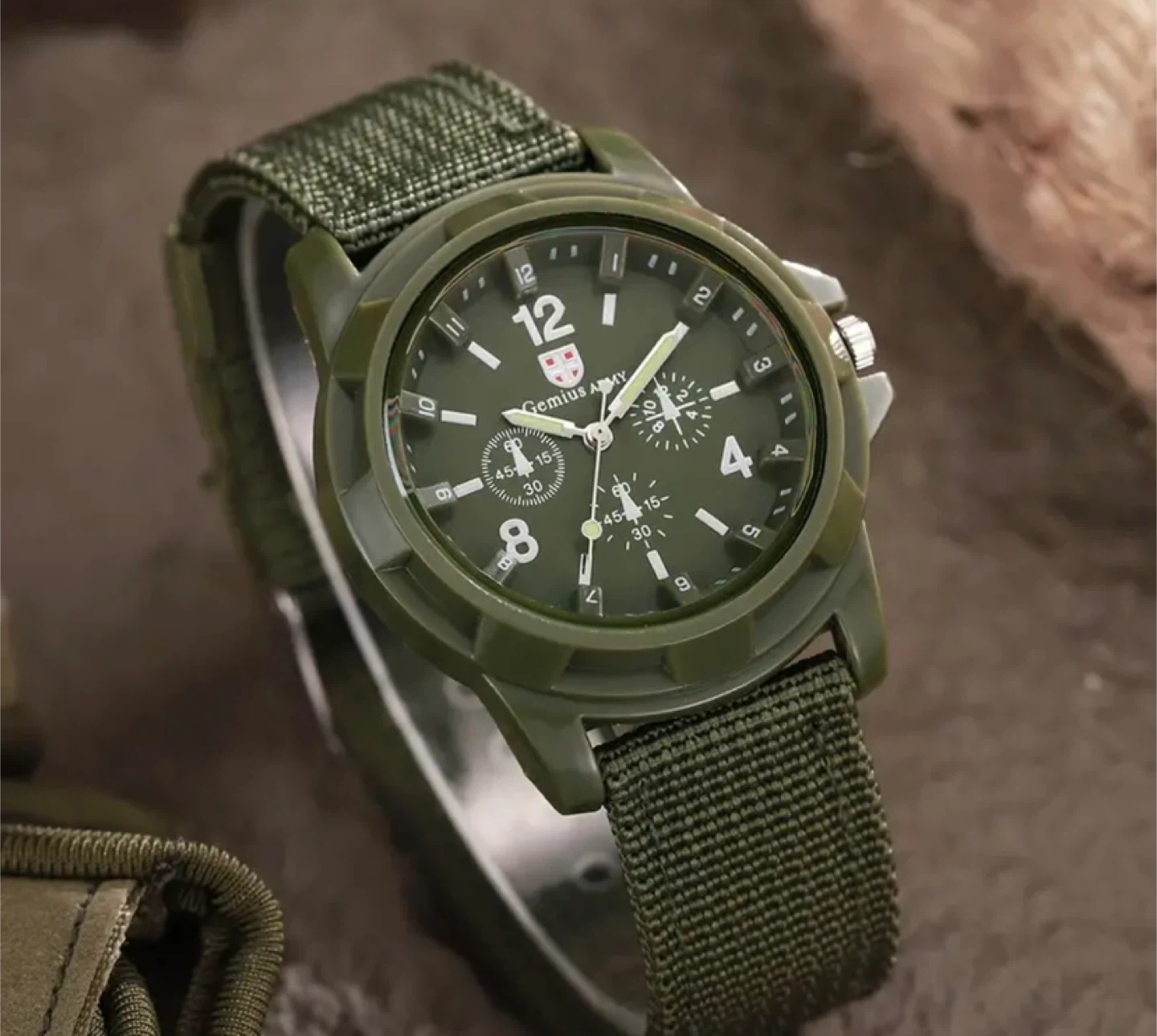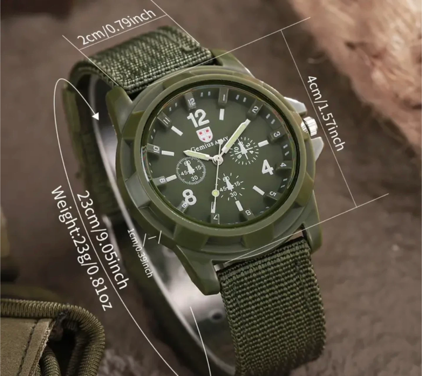 15This is a Genius Army watch in green. It has a fabric strap and a dial featuring clear numerals and markers. The watch weighs 23g/0.81oz and has a band width of 2cm/0.79inch. The dial has a diameter of 4cm/1.57inch