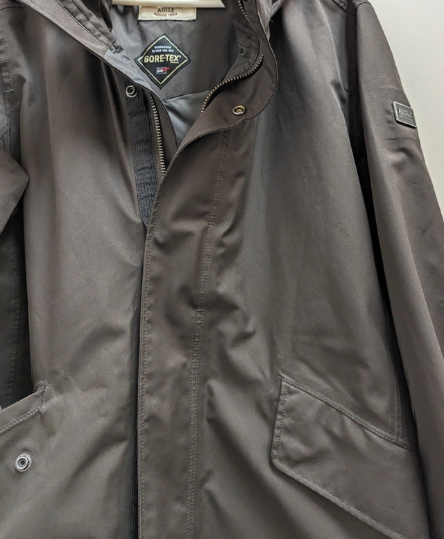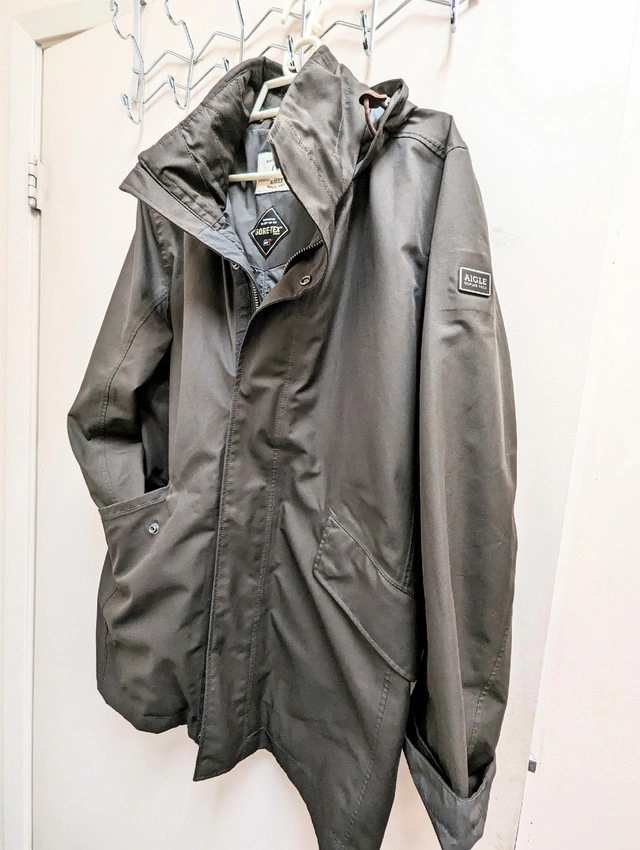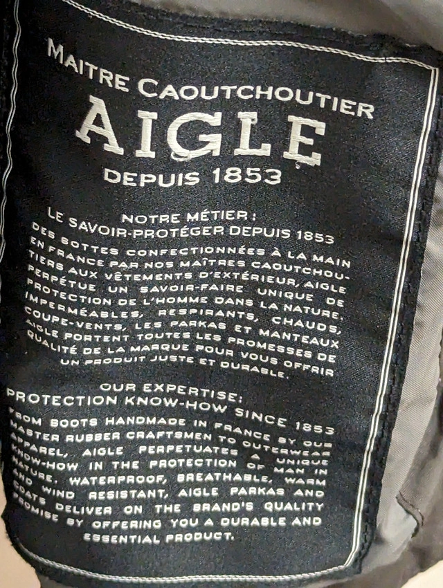 26Genuine Men's Aigle Gore-Tex Technology Parka Jacket. Large size. Price is fixed. Brand product. Comparable Aigle Jackets/Coats: https://www.aigle.com/int/en-ca/men-outdoor-clothing?prefn1=akeneo_excludedFromLocale&prefv1=false&prefn2=akeneo_gender&prefv2=H&prefn3=akeneo_style&prefv3=parka&prefn4=akeneo_technoFilter&prefv4=gore_tex&prefn5=isRupture&prefv5=false&prefn6=product-type-code&prefv6=0|1|2|3|4|5|6|7|8|9&start=0&sz=32&format=full Hidden Long Hooded Parka. Retails for $1200+ (CAD) Dollars. Not sold in Canada/States. Bought from Ukraine. Unique product line. Excellent condition. Signs of light use. Meet up only at Fairview Mall.