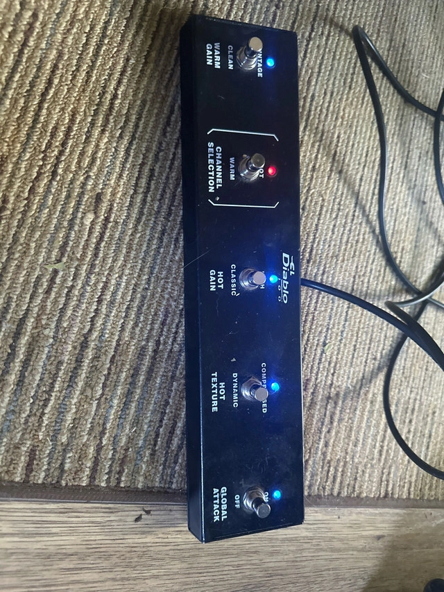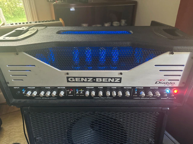 Selling a Genz Benz El Diablo 100-watt tube head, complete with its foot controller. This amp delivers powerful, versatile tones perfect for any guitarist looking for that classic tube sound. It's in good condition and ready to rock! * 100 Watts of Tube Power * Multi-Channel Operation * Includes Foot Controller Rear Panel: 50W/100W output selector offers the tone and feel of 2 different amps Dual speaker jacks with impedance selector switch and impedance calculator Direct output section: XLR frequency-compensated with ground lift, 1/4" line out, 0dB or -20dB switch Effects loops: individual WARM channel, HOT channel, and Global (serial) effects loops Footswitch: DIN plug input 115/230 voltage selector switch Front panel: Tube-buffered input stage Channel selector switch WARM tube channel--Clean or Vintage gain switch, Gain & Volume preamp controls; ±15dB bass, mid, treble tone shaping, Reverb Level control HOT tube channel--Classic or High gain switch, Dynamic or Compressed tube texture, Gain and Volume preamp controls, Tube Contour control, ±15dB bass, mid, treble tone shaping, Reverb Level control GLOBAL section--Attack switch with level control, Master Reverb control, Master Volume control Additional features: 2 independent tube channels 6 triode preamp stages (3 - 12AX7 tubes) 2 Ruby Tube EL34 power tubes EL 34 or 6L6 Power Tube Capability This amp has been my trusty companion for years, bringing the house down at countless gigs. Now, it's time for it to find a new home and make some more music! Don't miss out on this opportunity to own a fantastic piece of gear. Priced at $800 CAD. Remember, if the ad's up, it's still available!