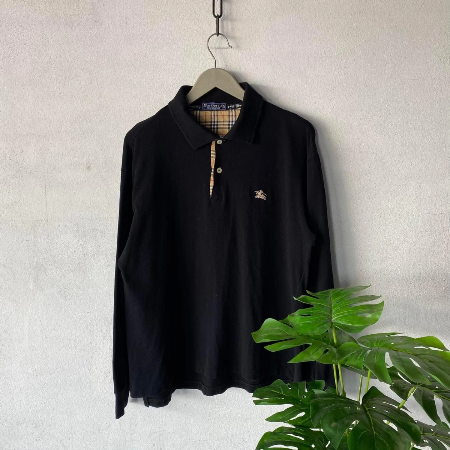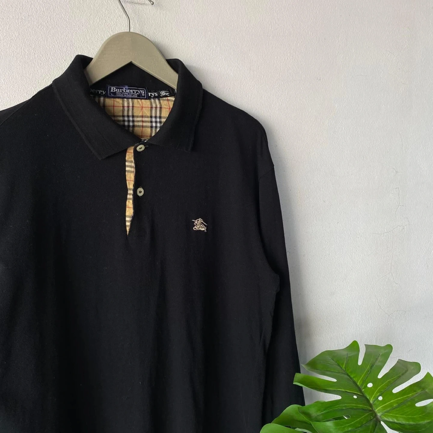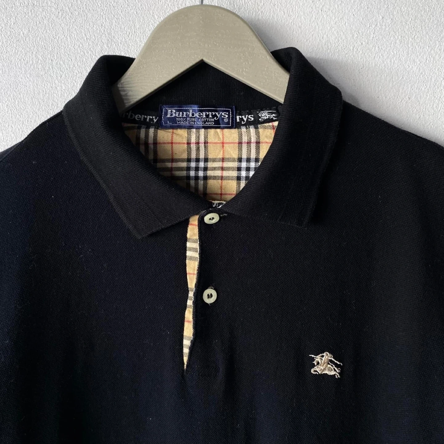 Here's a classic Burberrys long sleeve polo shirt! It's black with the iconic Burberry plaid pattern on the inside collar and button placket. The shirt is a size L and made of 100% pure cotton. It was made in England! Size L but fit like a medium