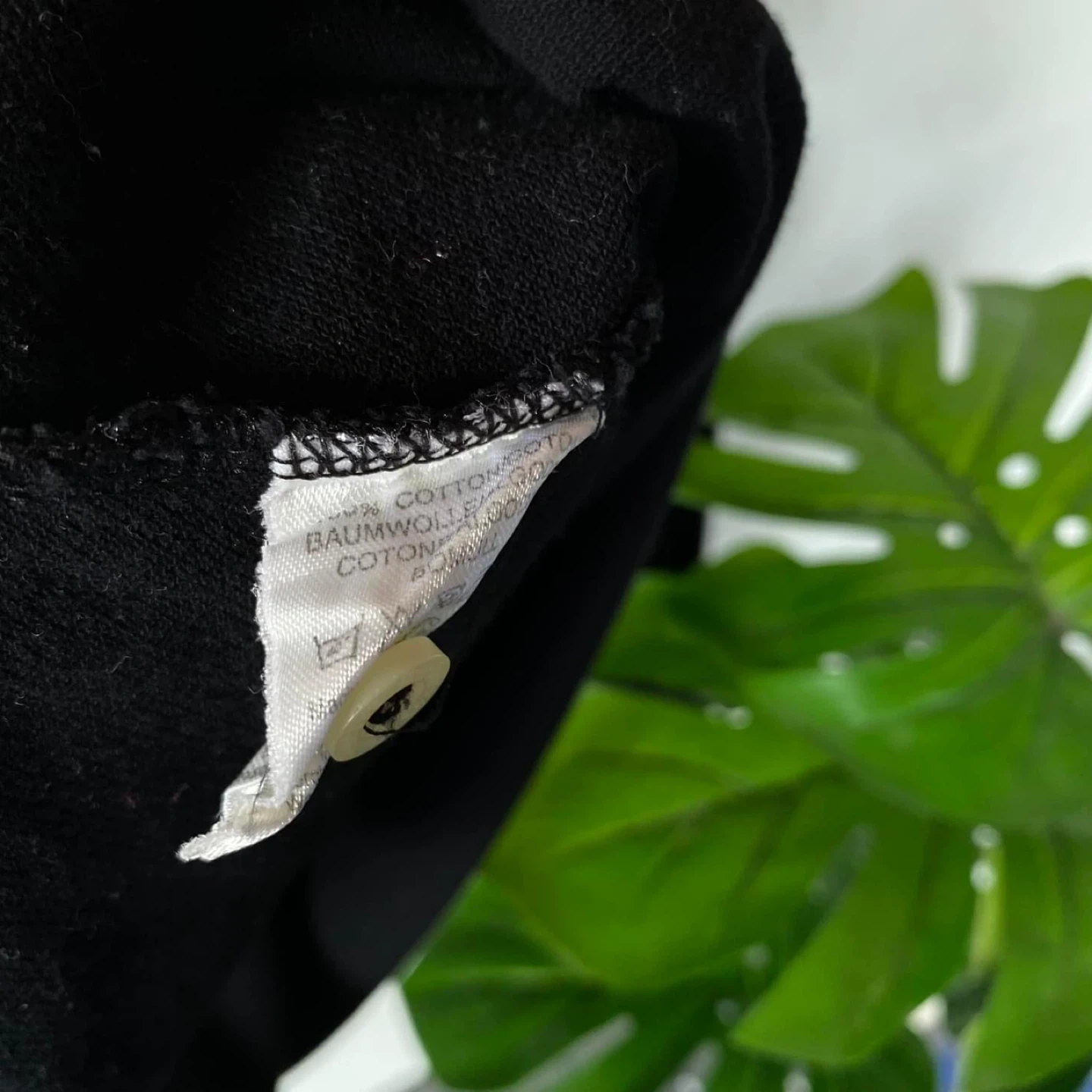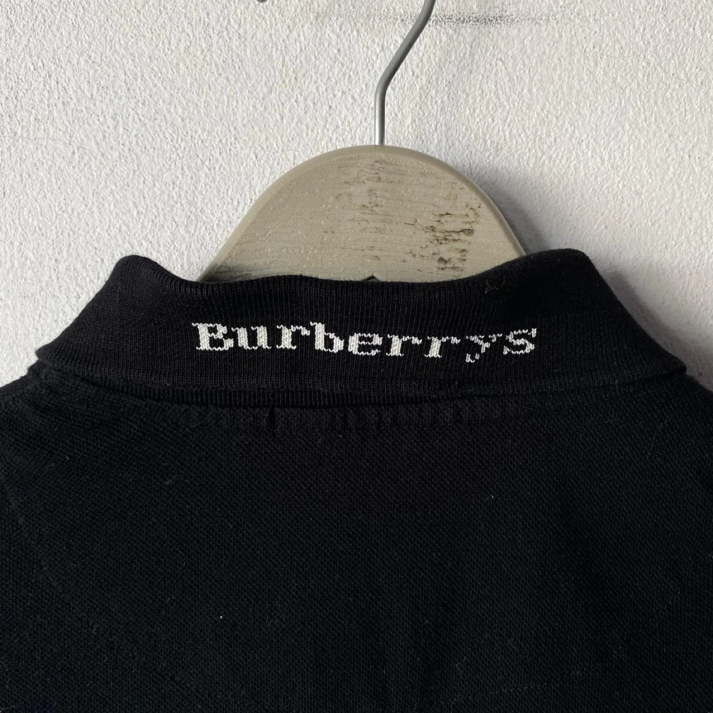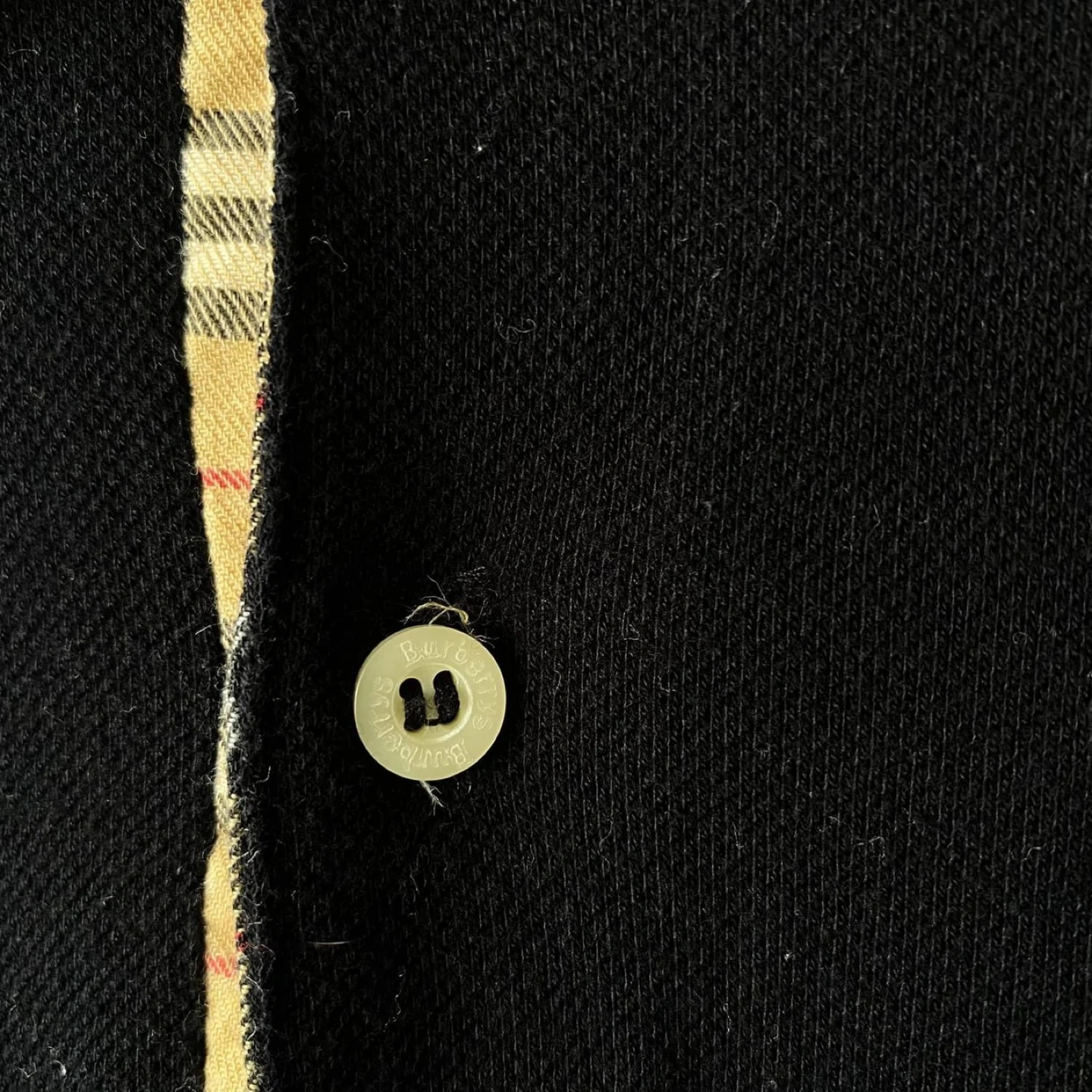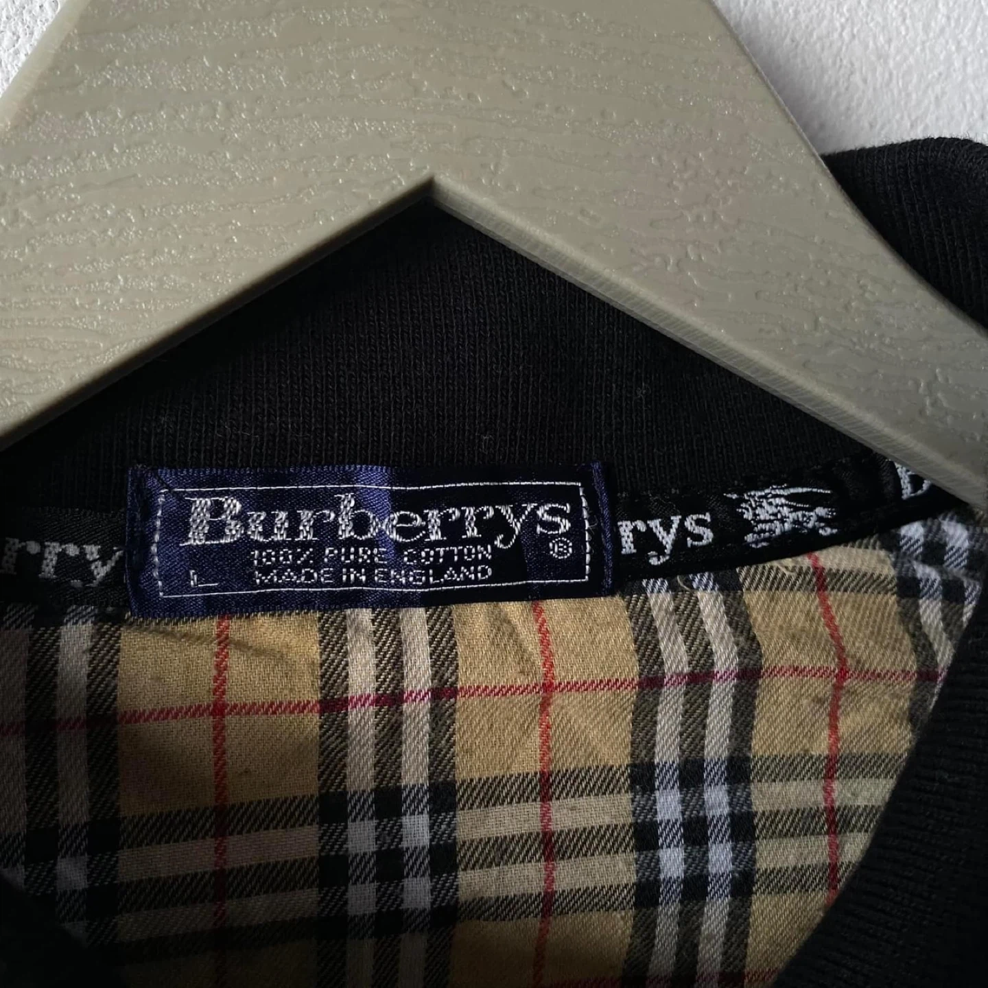 Here's a classic Burberrys long sleeve polo shirt! It's black with the iconic Burberry plaid pattern on the inside collar and button placket. The shirt is a size L and made of 100% pure cotton. It was made in England! Size L but fit like a medium