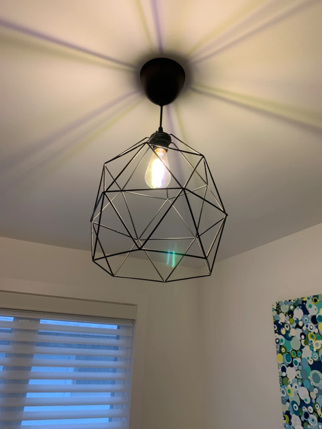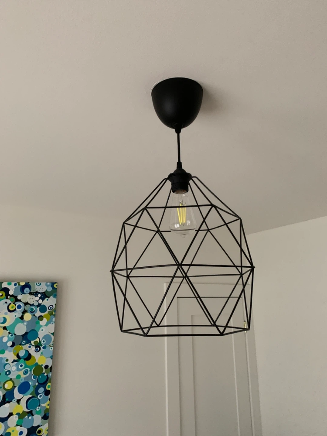 26Add a modern touch to your home with this stylish geometric pendant light! The black metal frame creates a striking visual. It's in great condition and ready to brighten up any room