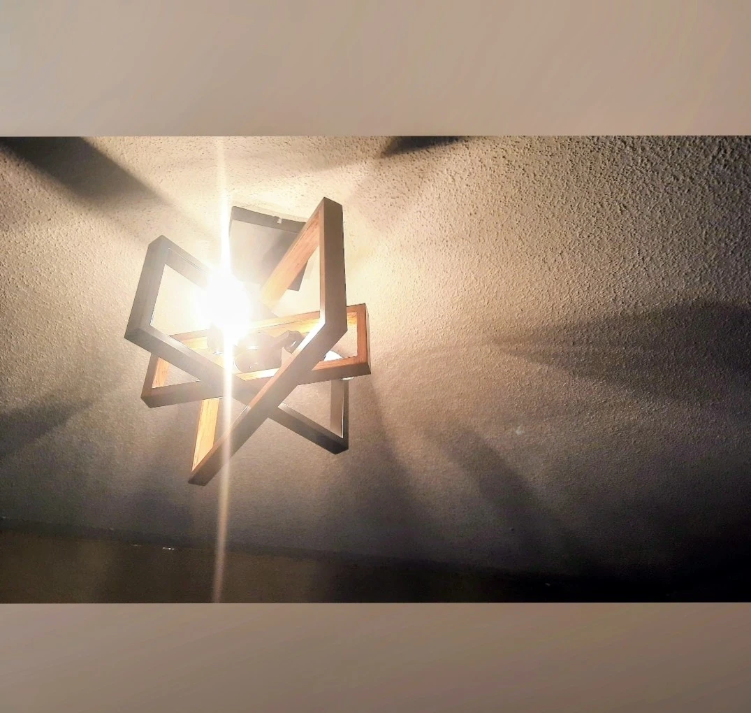 20Selling a unique, like new, geometric ceiling light fixture! It's made of metal faux wood colour and creates a cool, modern look in any room. The light casts interesting shadows, adding a bit of flair to your space. This flush mount ceiling light is 15.8” in D X 12.4” in H. The canopy is 4.72”, made of Hand-painted faux wood color