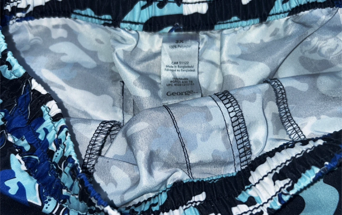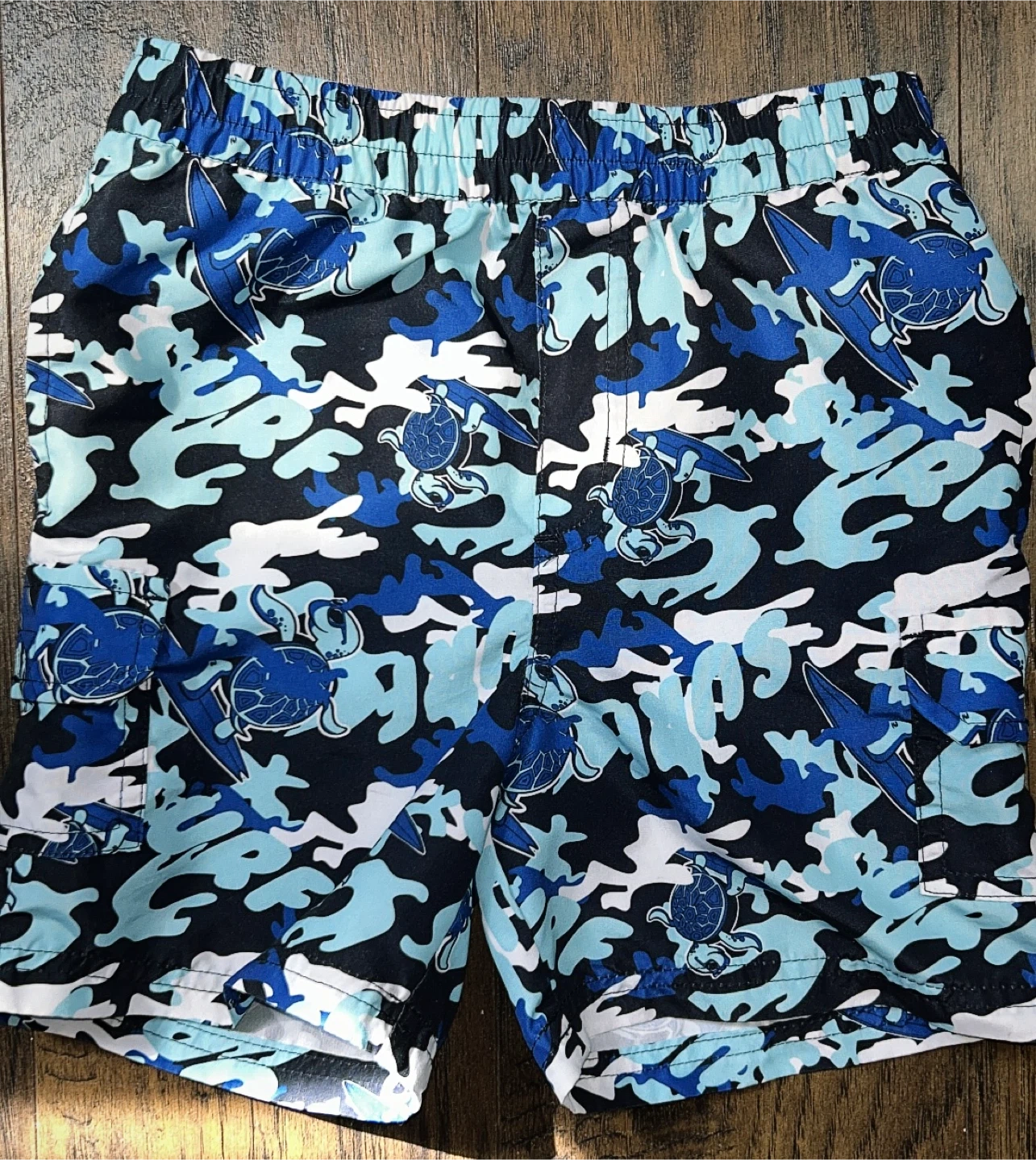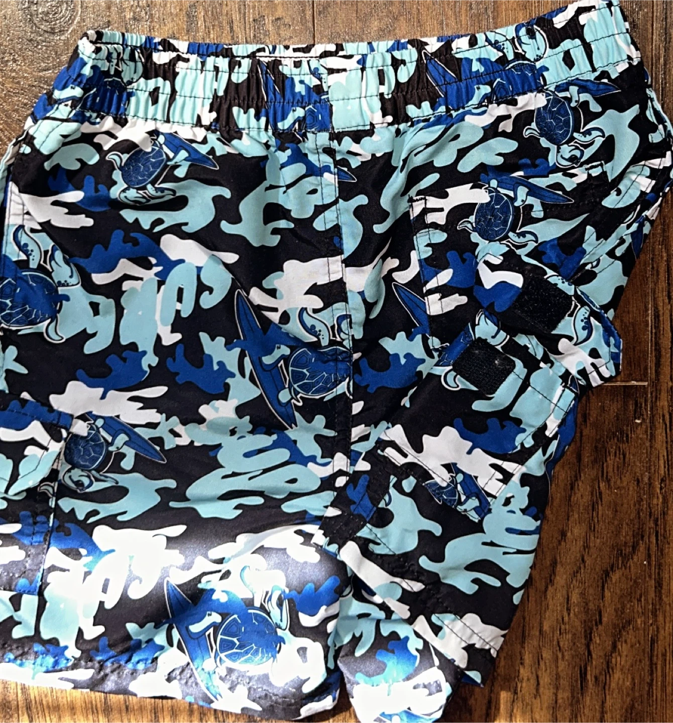15Cute George brand swim trunks in size 3T! They feature a fun blue camo pattern with shark designs. Made of 100% polyester, they're perfect for a day at the beach or pool