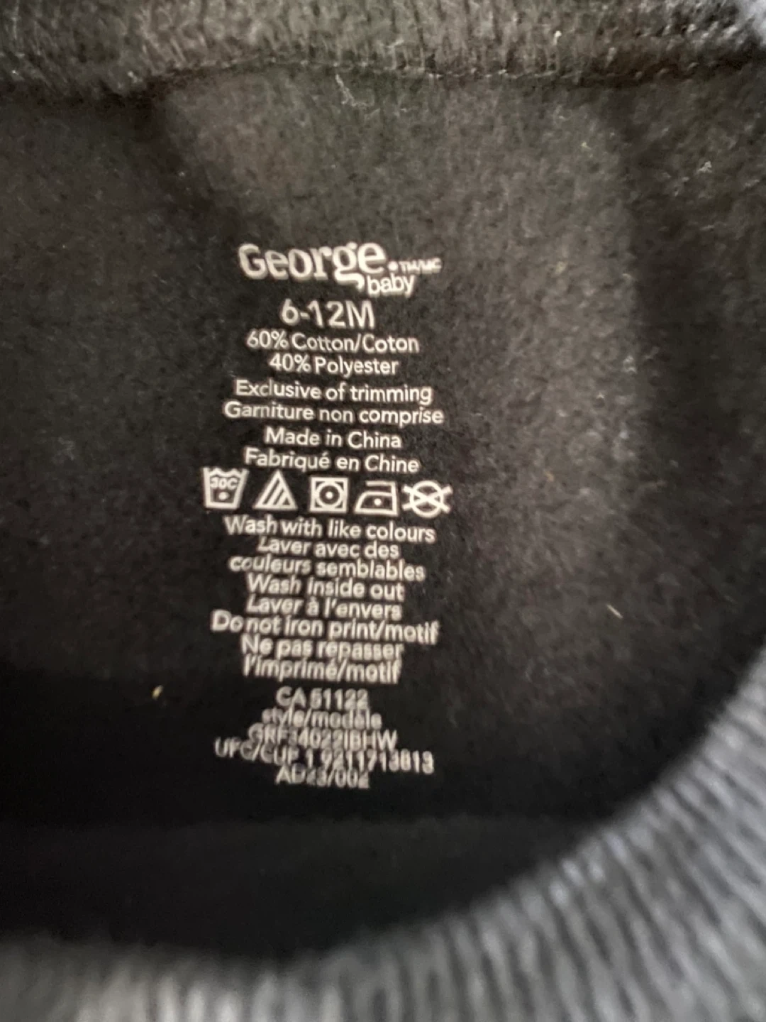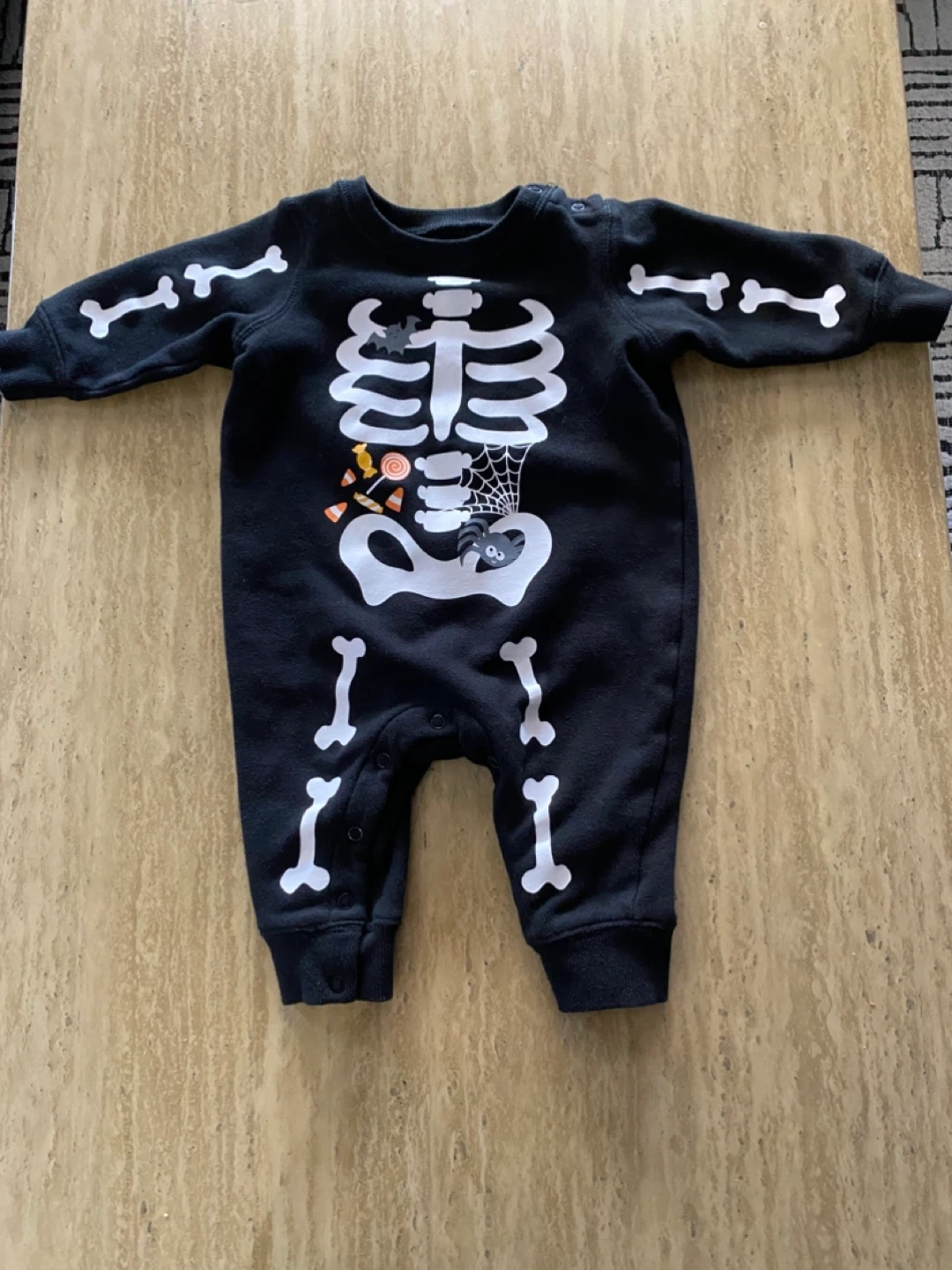 77A cute George Baby onesie in size 6-12M. It is black with a Halloween skeleton design on the front. Made of 60% cotton and 40% polyester, it's perfect for your little one! Pick up Sage Hill NW Cash only Pet and smoke free home Check out my other items