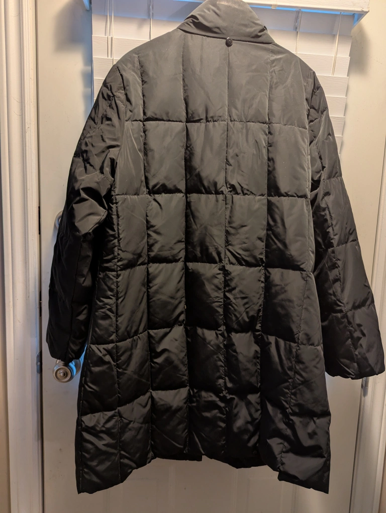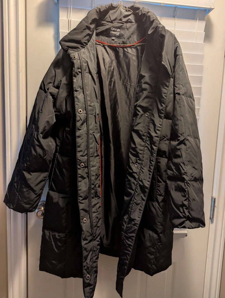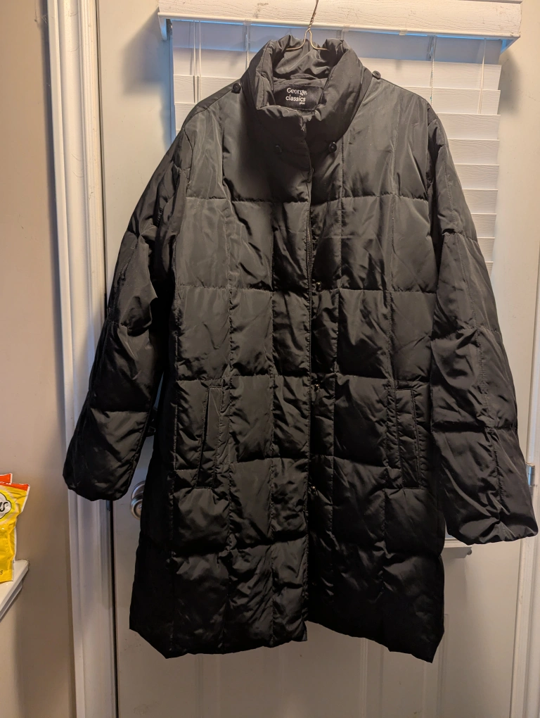 Here's a George Classics black puffer coat, perfect for staying warm during the colder months! It's in great condition and ready for a new home. It's a stylish and practical addition to any wardrobe Height from top to bottom of coat is 40 inches Fixed price $20