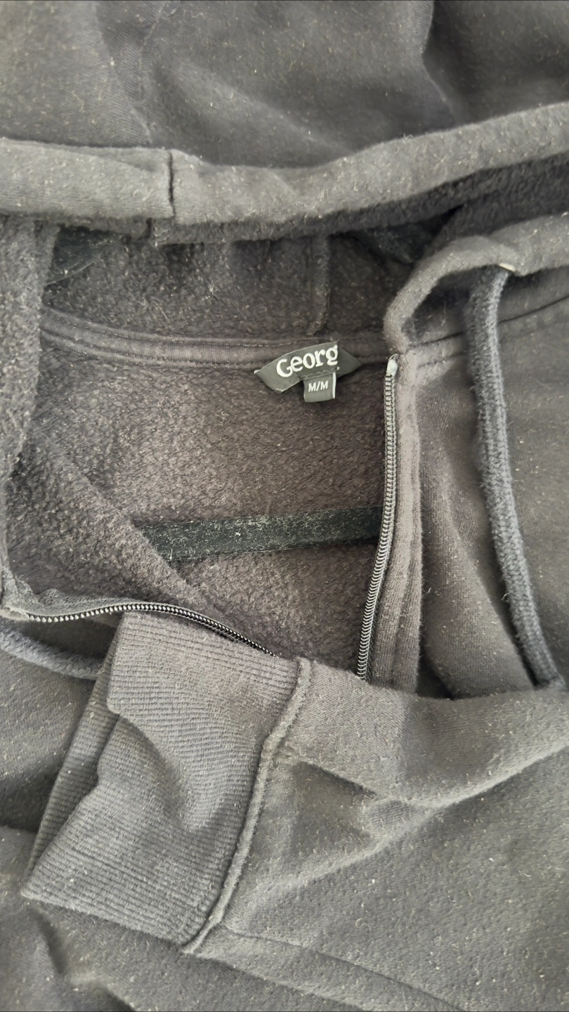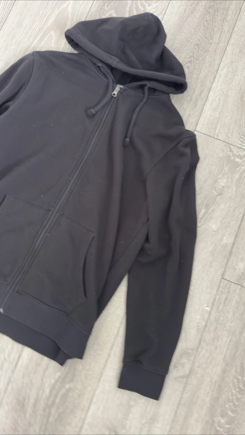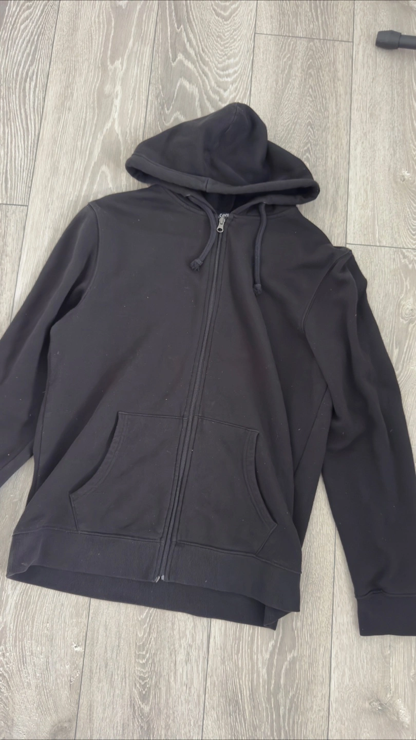 Men's black zip-up hoodie. Features a hood with drawstrings, front pouch pocket, and long sleeves. Size Medium.