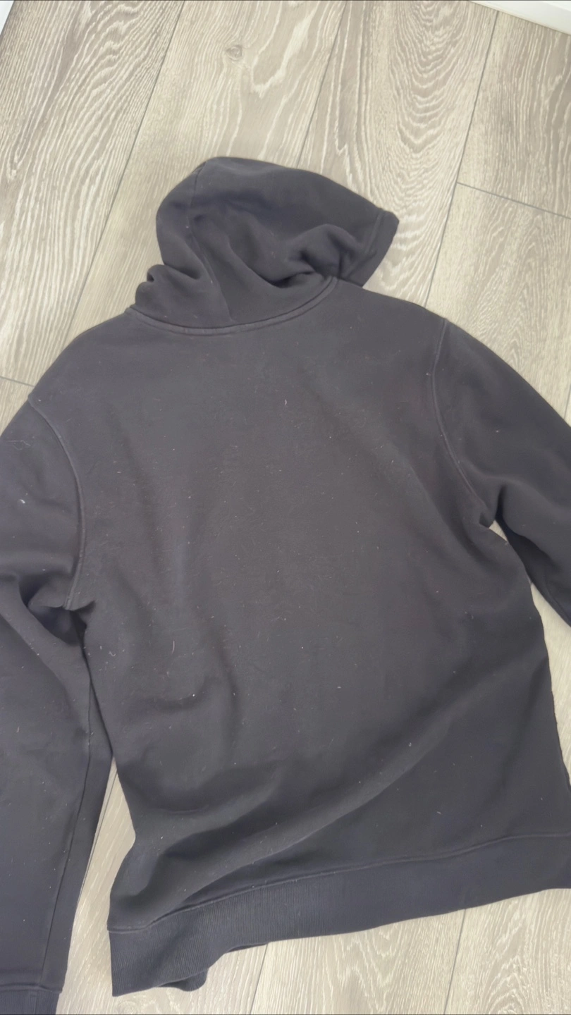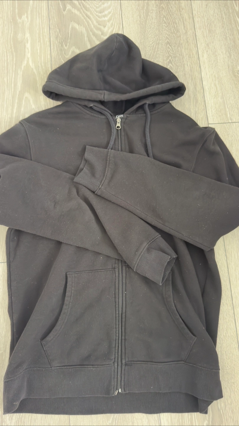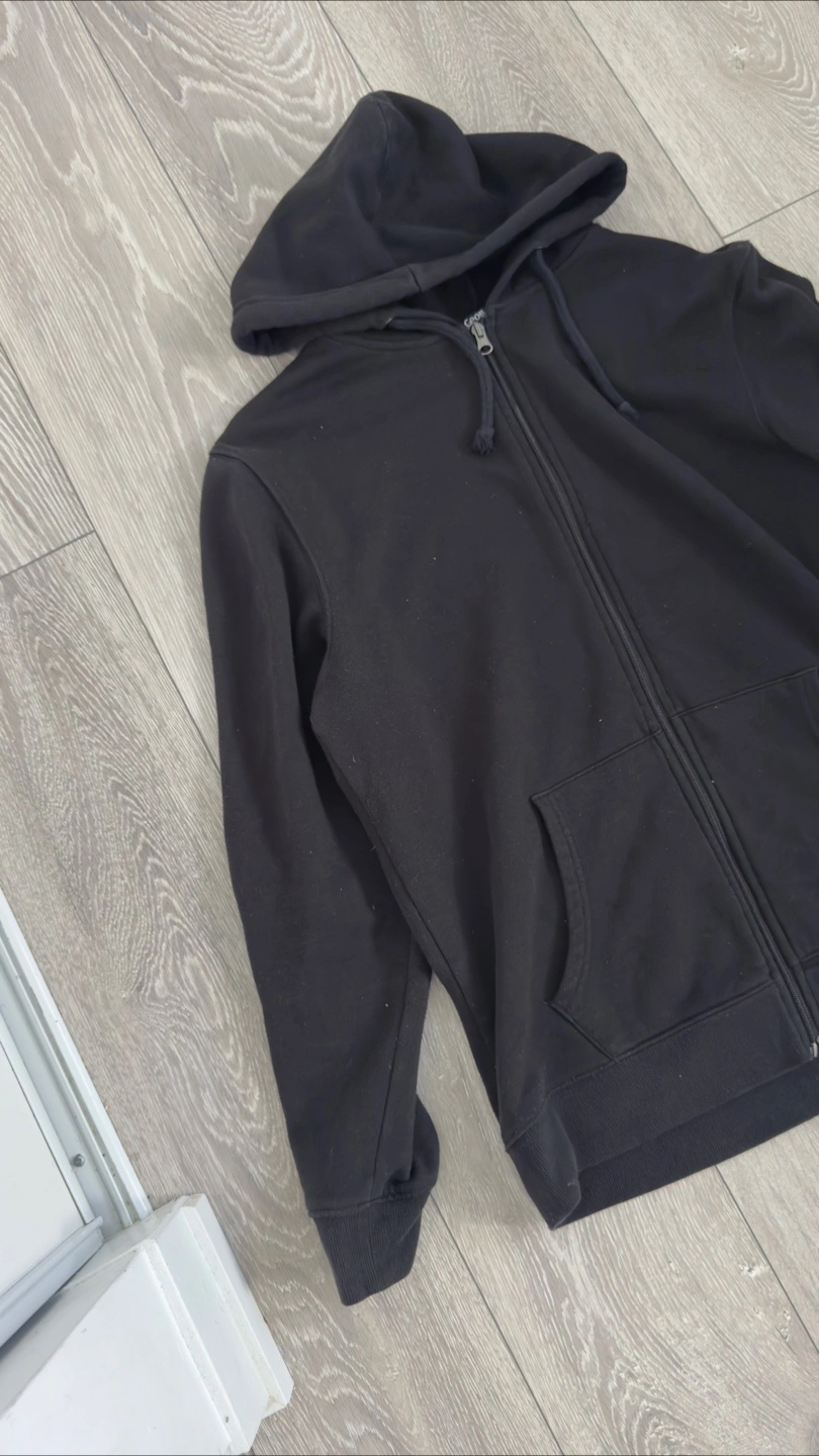 Men's black zip-up hoodie. Features a hood with drawstrings, front pouch pocket, and long sleeves. Size Medium.