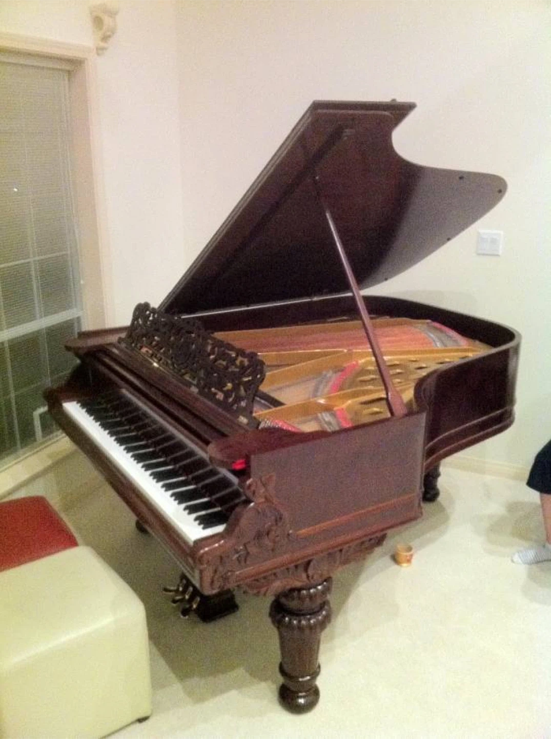 15This rare 1885 George Steck Victorian parlor grand piano is a museum-quality showpiece combining superb 19th-century American piano construction with ornate Victorian aesthetic elegance. The carved case in rosewood/mahogany, scrollwork legs, pierced music rack, and lyre pedal design make it a visual jewel. Under the lid lies a full cast-iron plate, beautifully scaled bridges, and an action rebuilt to historically sympathetic standards. Tonally, it sings with clear trebles, warm mids, and a refined bass that reflects Steck’s original design philosophy. Whether displayed as a work of art or played in period repertoire, this piano is a rare bridge between decorative arts and musical heritage.”