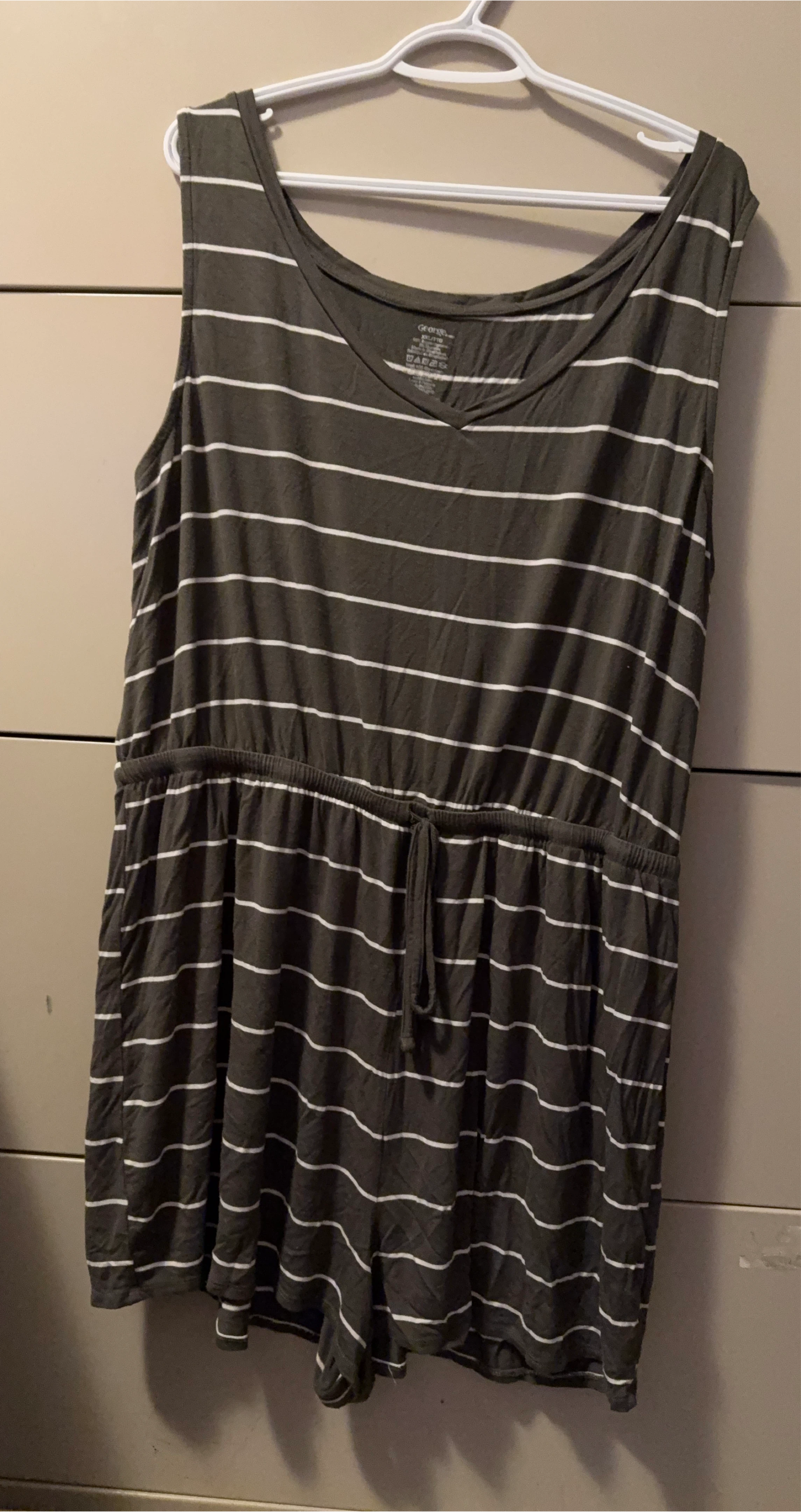 60This super cute George romper is perfect for warm weather! It's a size xxl and features a stylish striped pattern. The material is lightweight and comfy, making it great for everyday wear