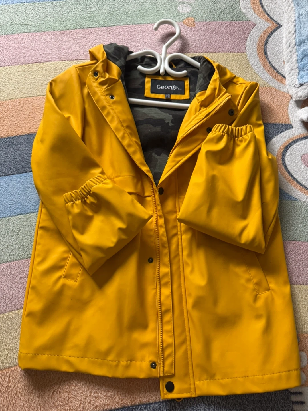 60A bright yellow rain jacket from George! It's in great condition and ready to keep someone dry on those rainy days. The inside lining has a cool camouflage pattern. Size is XL.