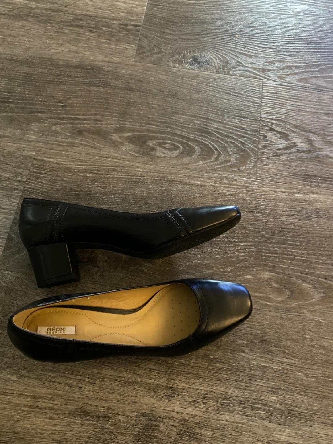 10These are a pair of Geox black leather pumps. They have a block heel and are in great condition. Perfect for work or a night out!