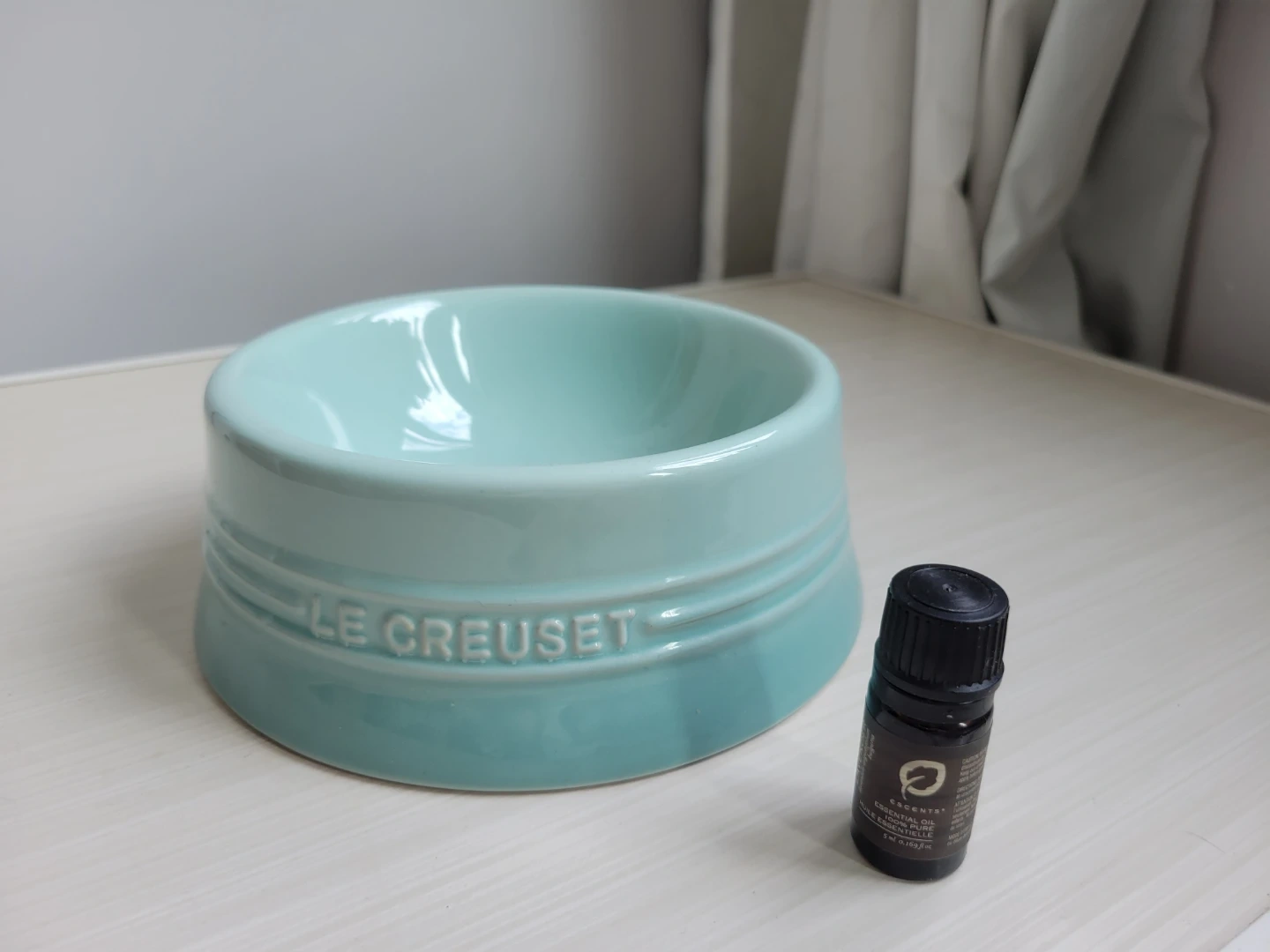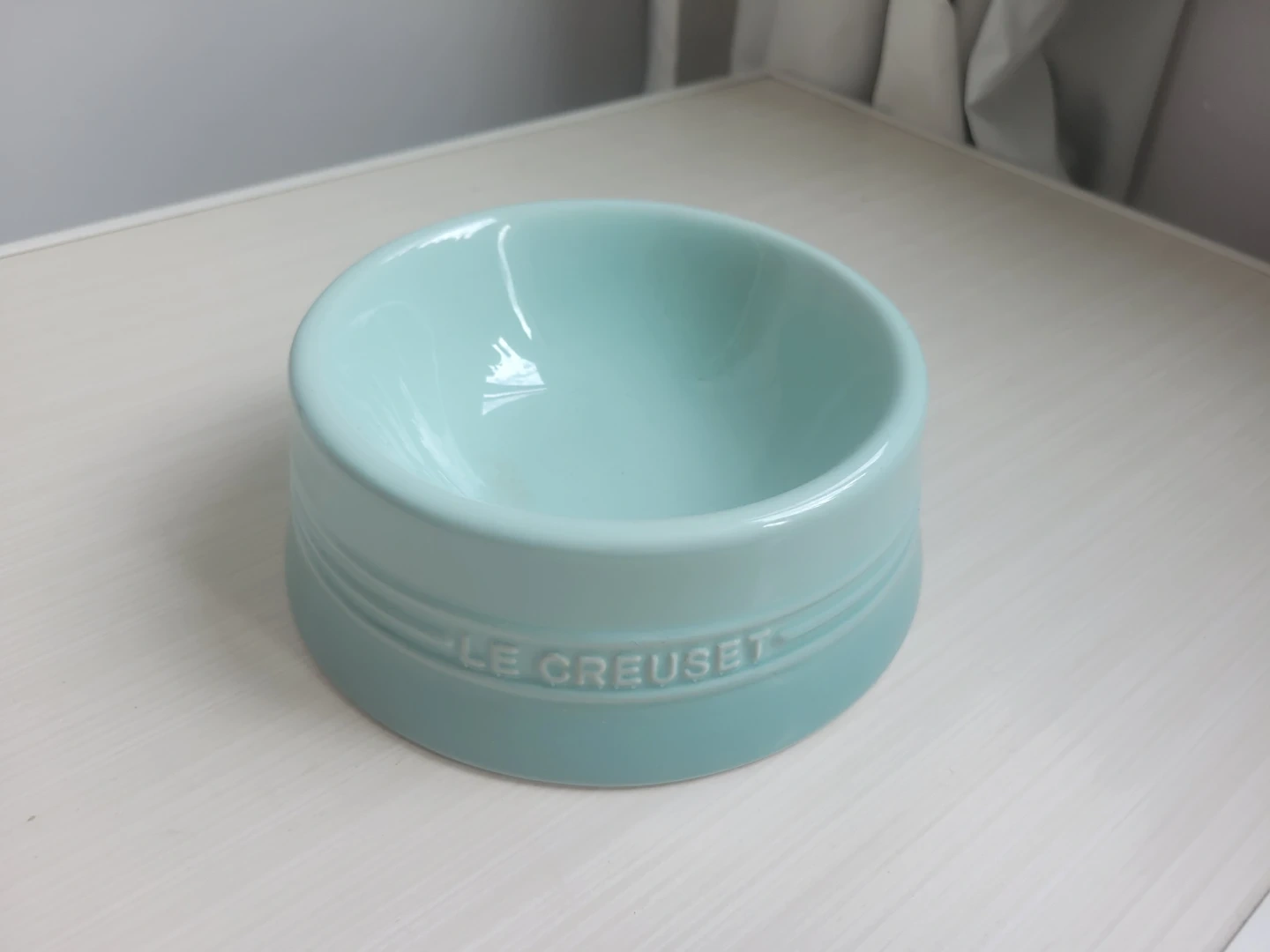 Le Creuset pet bowl in Sage, a beautiful blue-turquoise colour. This ceramic bowl is sturdy and easy to clean. Perfect for your furry friend's food or water!
