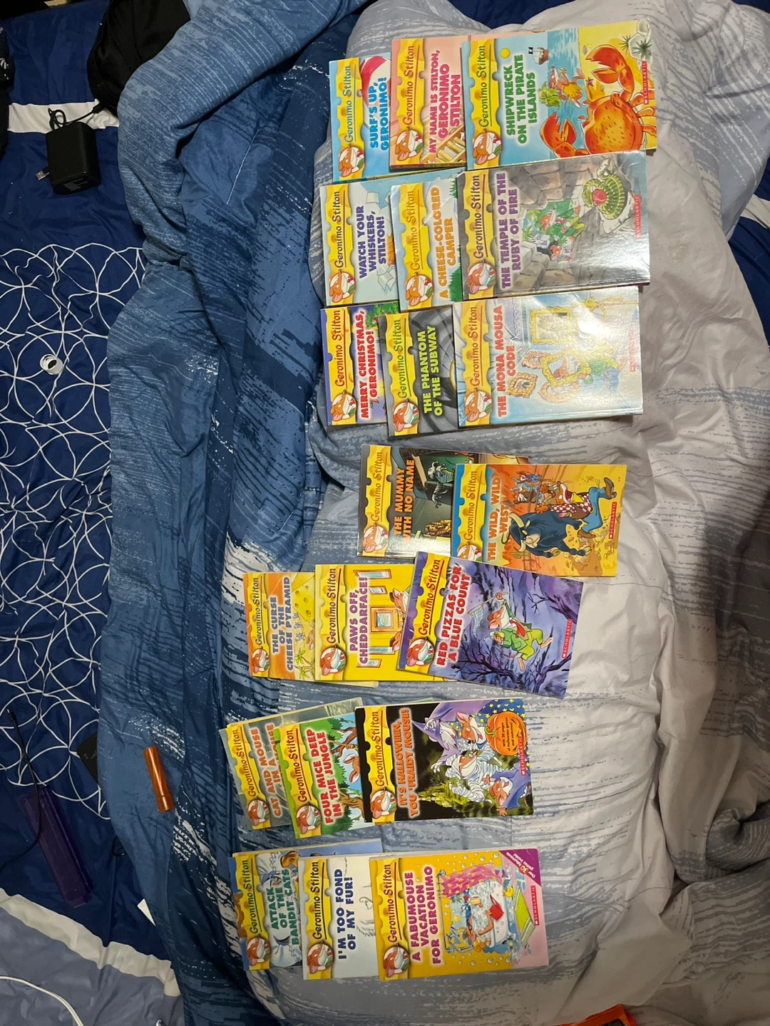 10Selling a large collection of Geronimo Stilton books! Great for young readers who enjoy adventure and mystery. Titles include: - Attack of the Bandit Cats - I'm Too Fond of My Fur! - A Fabumouse Vacation for Geronimo - Cat and Mouse in a Cave - Four Mice Deep in the Jungle - It's Halloween, You Fraidy Mouse! - The Curse of the Cheese Pyramid - Paws Off, Cheddarface! - Red Pizzas for a Blue Count - The Mummy With No Name - The Wild, Wild West - Merry Christmas, Geronimo! - The Phantom of the Subway - The Mona Mousa Code - Watch Your Whiskers, Stilton! - A Cheese-Colored Camper - The Temple of the Ruby of Fire - Surf's Up, Geronimo! - My Name is Stilton, Geronimo Stilton - Shipwreck on the Pirate Islands