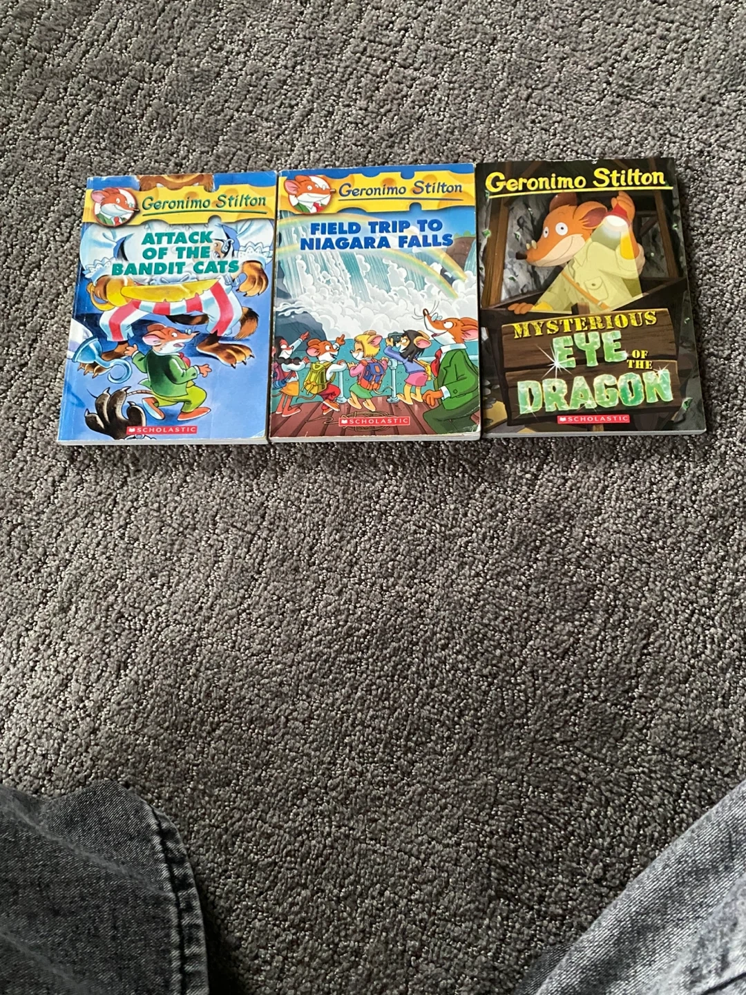 15Selling a set of three Geronimo Stilton books! Titles include: - Field Trip to Niagara Falls - Mysterious Eye of the Dragon - Attack of the Bandit Cats Great for young readers!