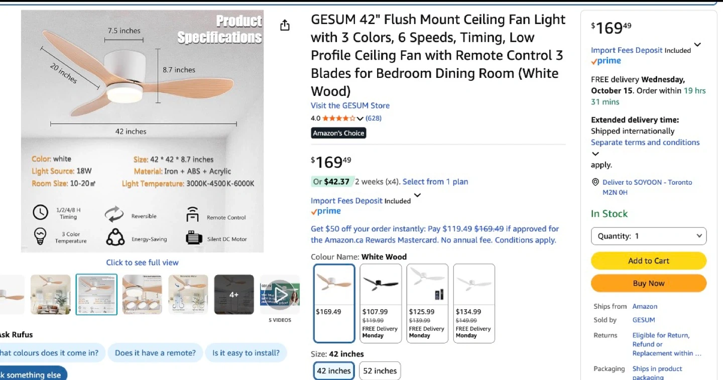 28I bought it last year for the guest room, so it’s almost like new. It hasn’t been used. I’m sure you’ll like it once you see the actual condition. Thank you. Looking to brighten up your space? I’m selling a GESUM 42” flush mount ceiling fan with a beautiful white wood finish. Key features: • 3 colour modes • 6 speed settings • Timing function • Low-profile design (great for low ceilings) • Remote control included Perfect for a bedroom or dining room! Originally purchased for $169.49, and it’s brand new — never used. Selling because I’m moving overseas. Pickup only. Thank you!