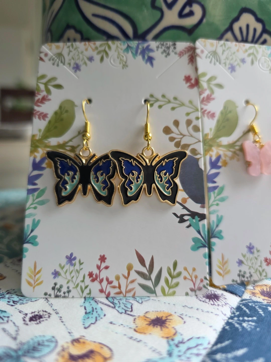 A set of three pairs of dangle earrings, including two butterfly designs (one blue, one pink) and one pair with clear crystal charms. All earrings feature gold-tone hooks.