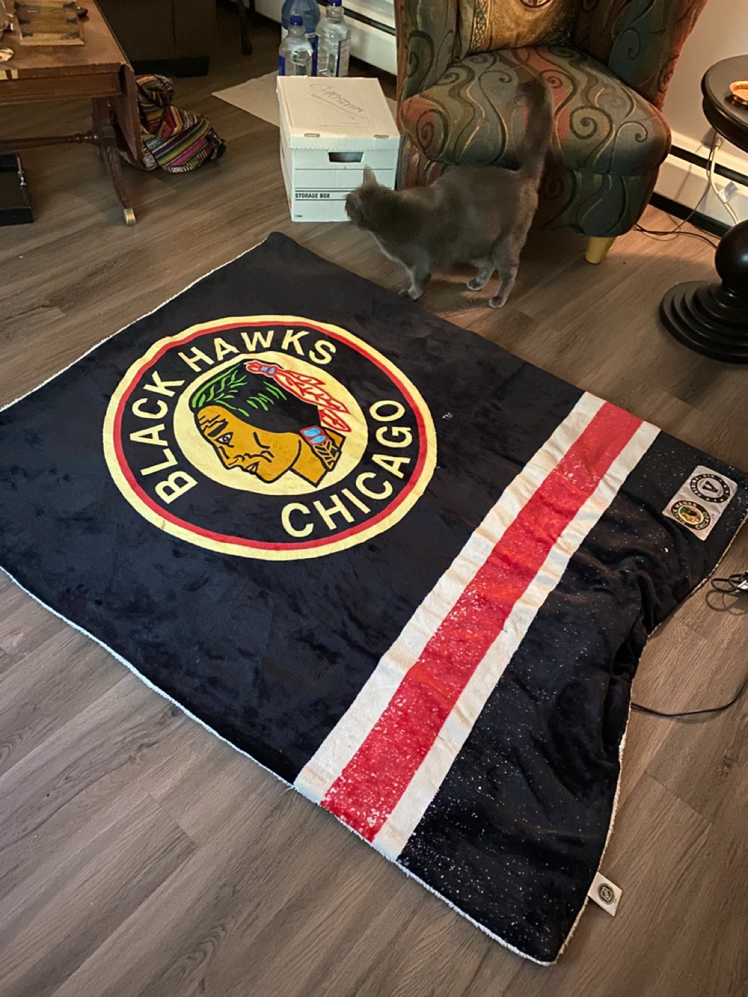 Stay warm with this Chicago Blackhawks heated throw blanket! It features the team's vintage logo and signature colours. The blanket includes a power cord and controller for adjustable heat settings. Perfect for any Blackhawks fan looking to get cozy.
