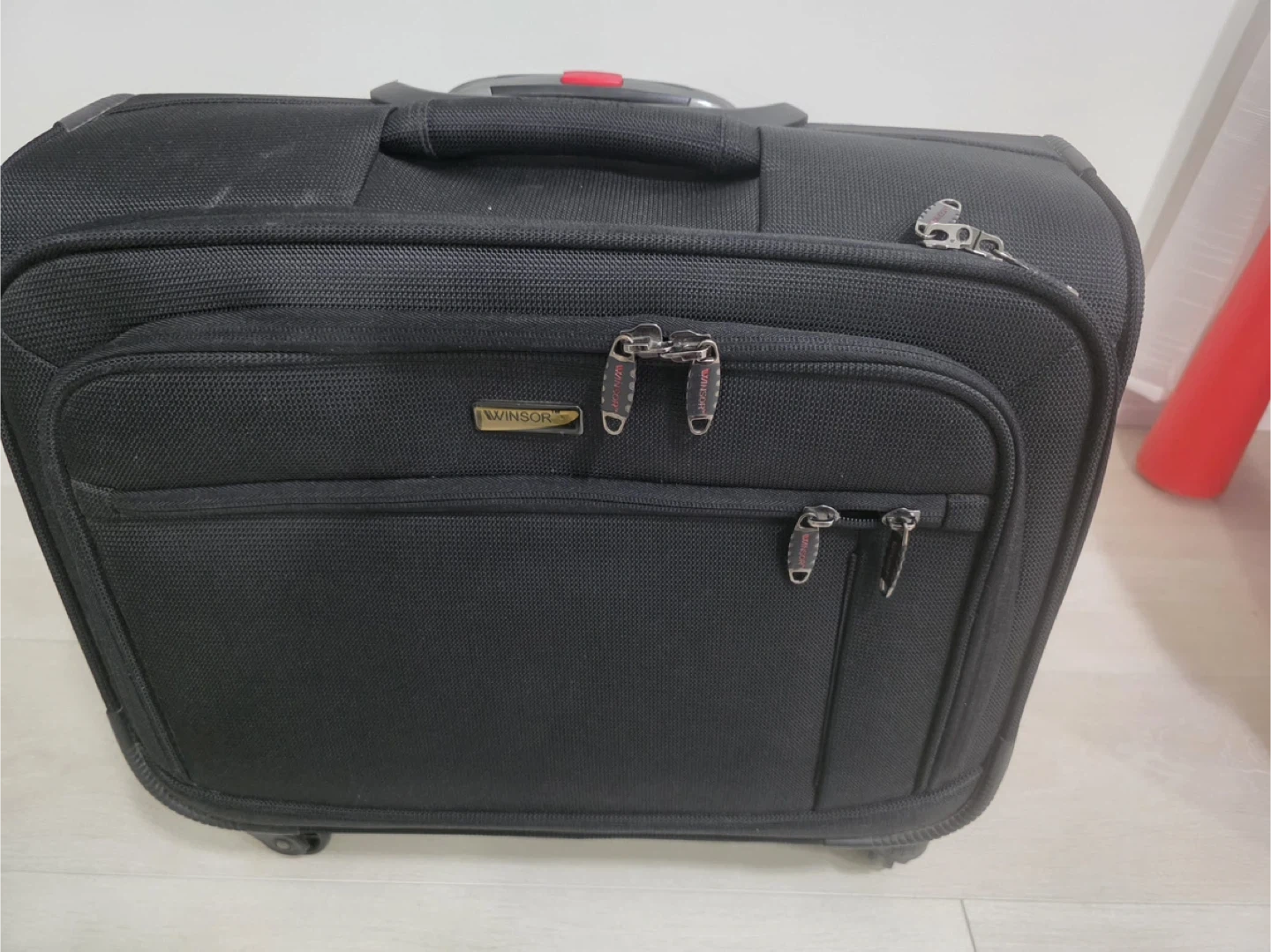 This is a black Winsor carry-on roller bag. It's made of durable fabric and features a telescoping handle and wheels for easy transport. The interior has elastic straps to secure your belongings. Great for short trips or business travel!