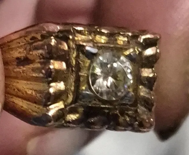 Ring with a textured gold-tone band and a central clear stone. It's a statement piece for any jewellery collection! Perfect for those who appreciate bold accessories.
