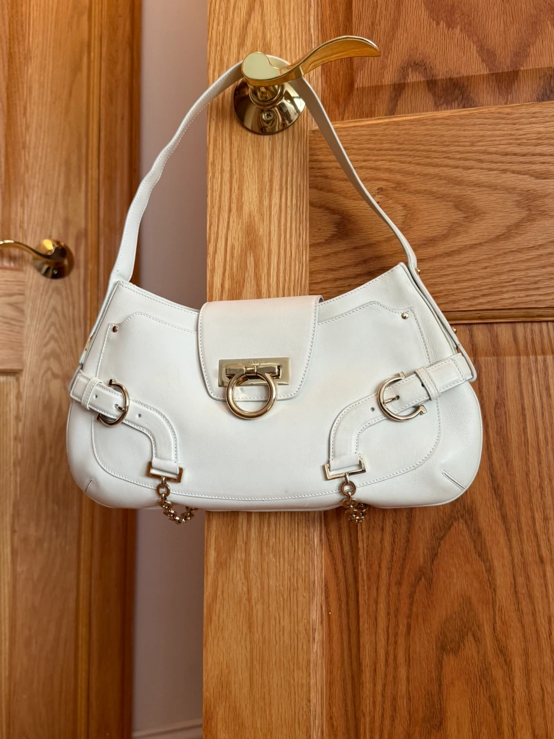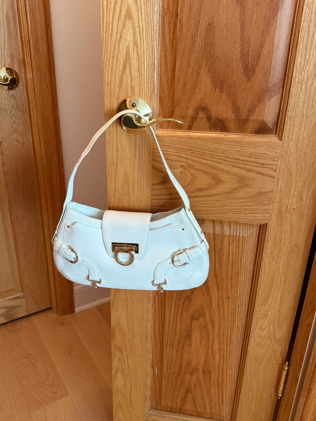 Salvatore Ferragamo white leather shoulder bag. It features a secure clasp closure and an interior zip pocket. The bag has a classic design with gold hardware accents & yellow interior lining