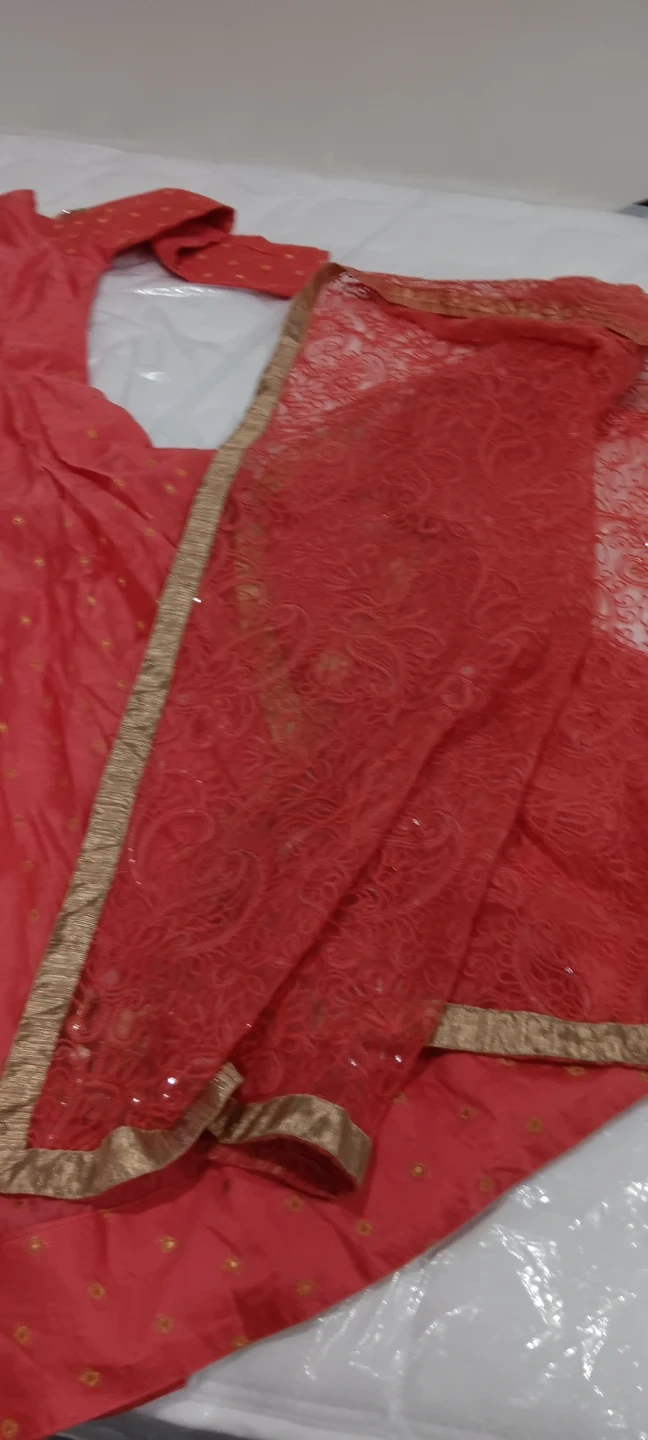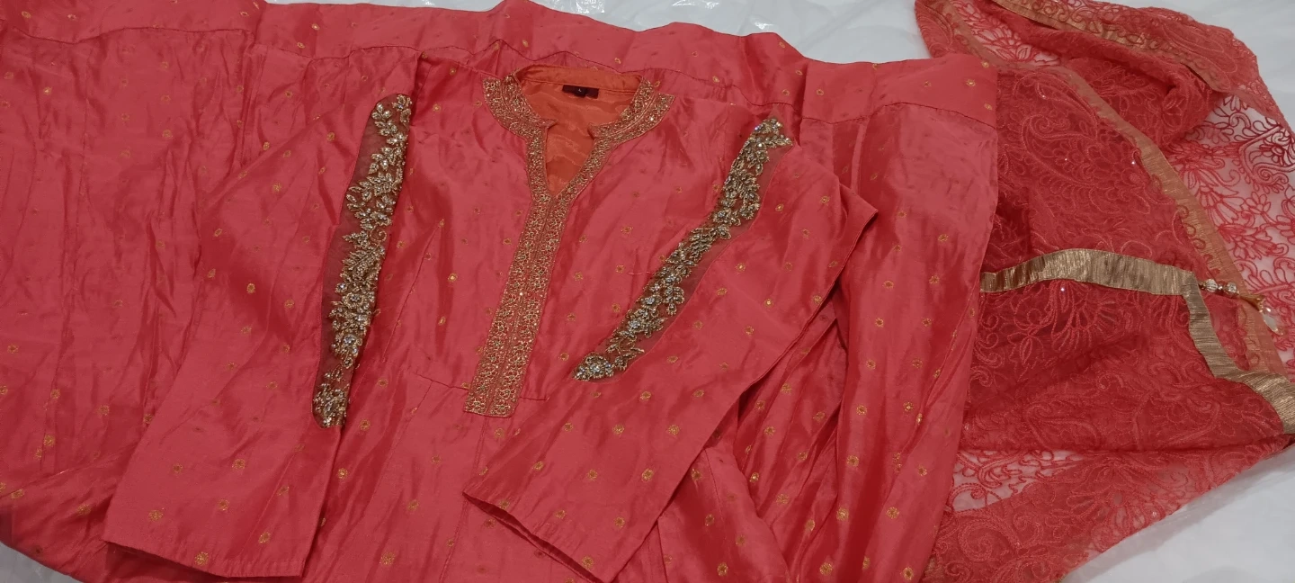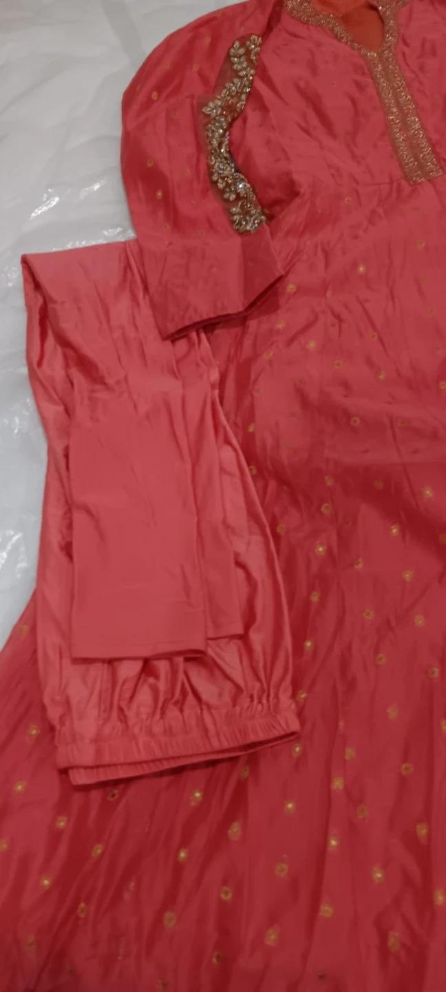 This is an orange sute set with a matching dupatta. It features gold dotted patterns all over the fabric and intricate embroidery on the neckline and sleeves. The kameez has a V-neck and full-length sleeves. It includes matching pants.