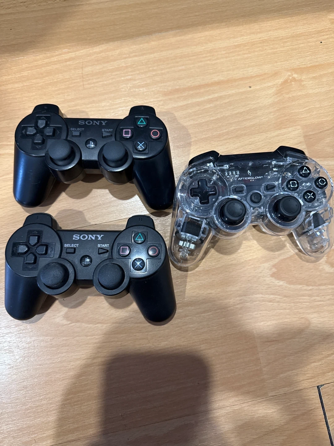 Selling two black Sony DualShock 3 controllers and one clear Afterglow controller for PlayStation 3. They're in good working condition. All three controllers are compatible with the PS3 system.