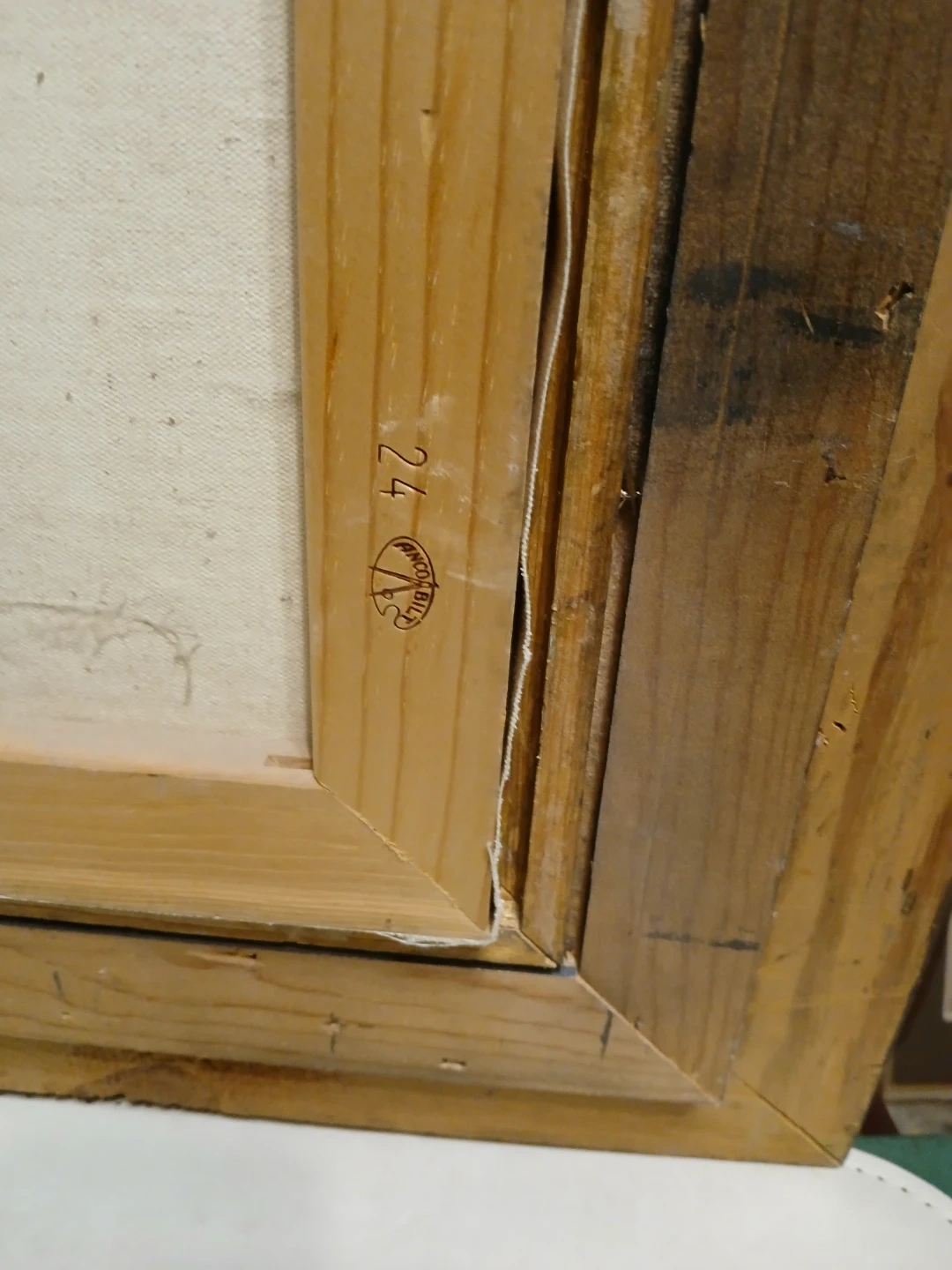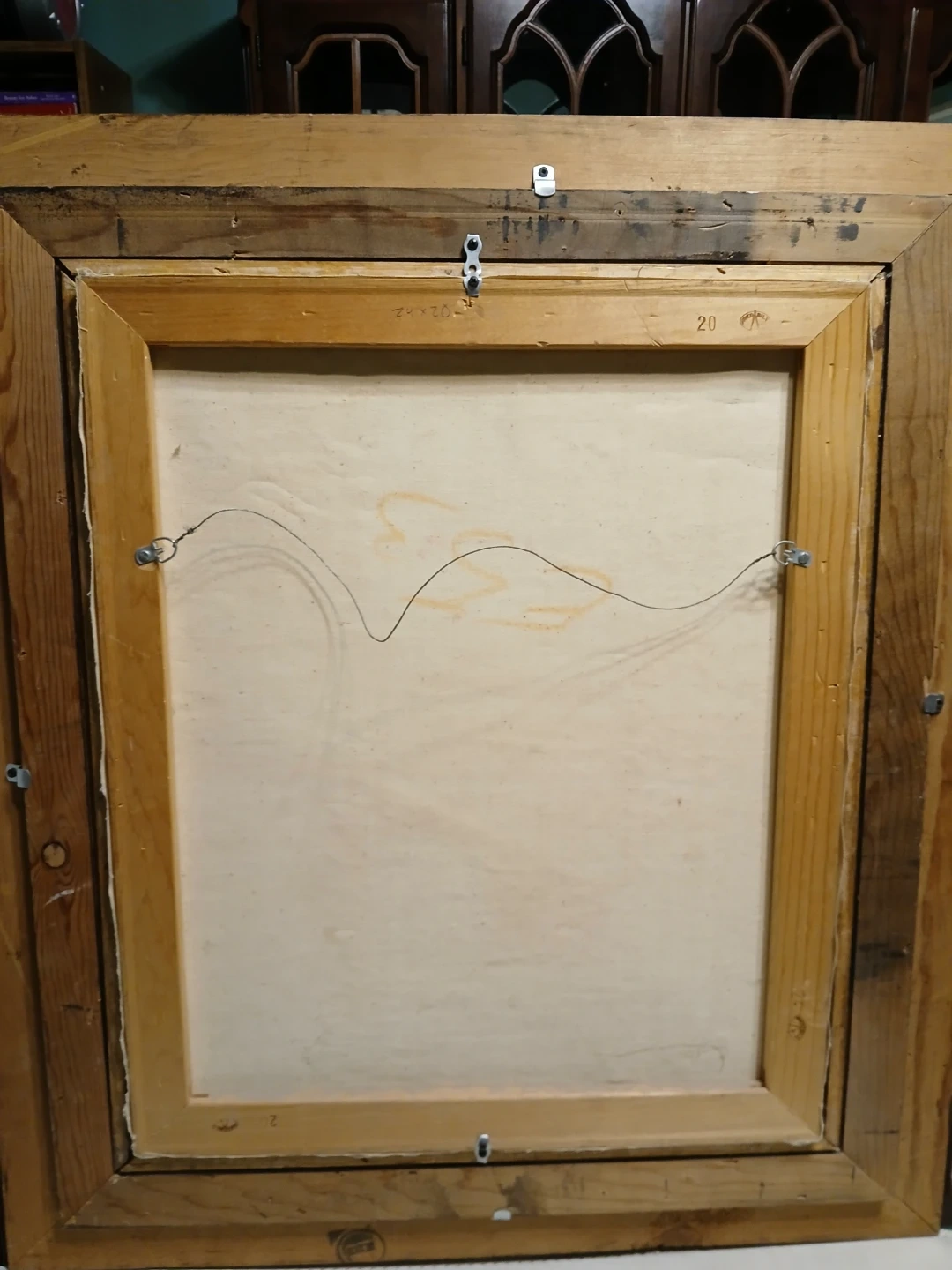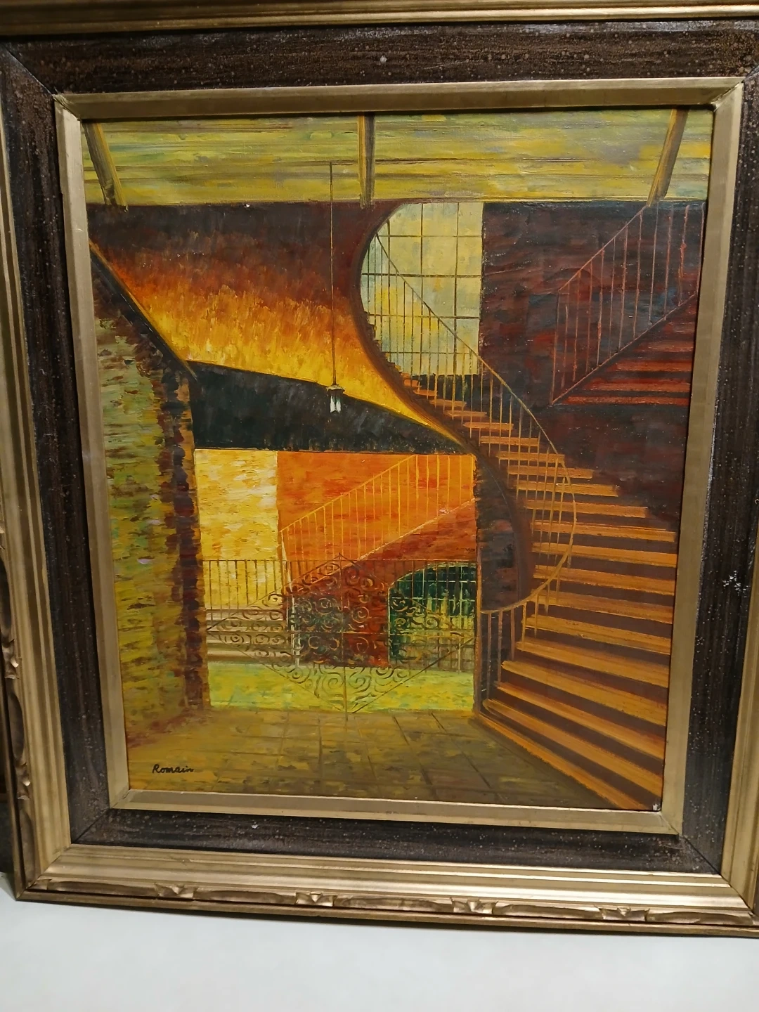 This is an original oil painting signed Romain. It depicts an interior scene with stairs and yellow-toned walls. Framed and ready to hang!