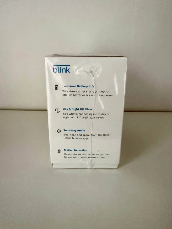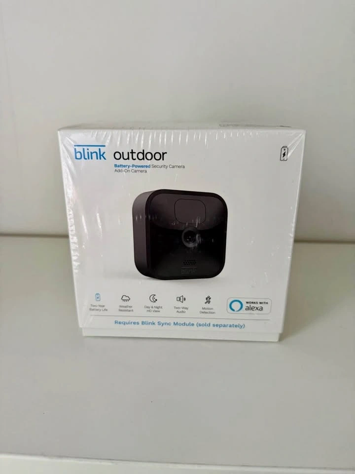 Selling a brand new Blink Outdoor battery-powered security camera! It's still in its original packaging. Key features include: Two-year battery life, Day & Night HD view, Two-way audio, Motion detection.