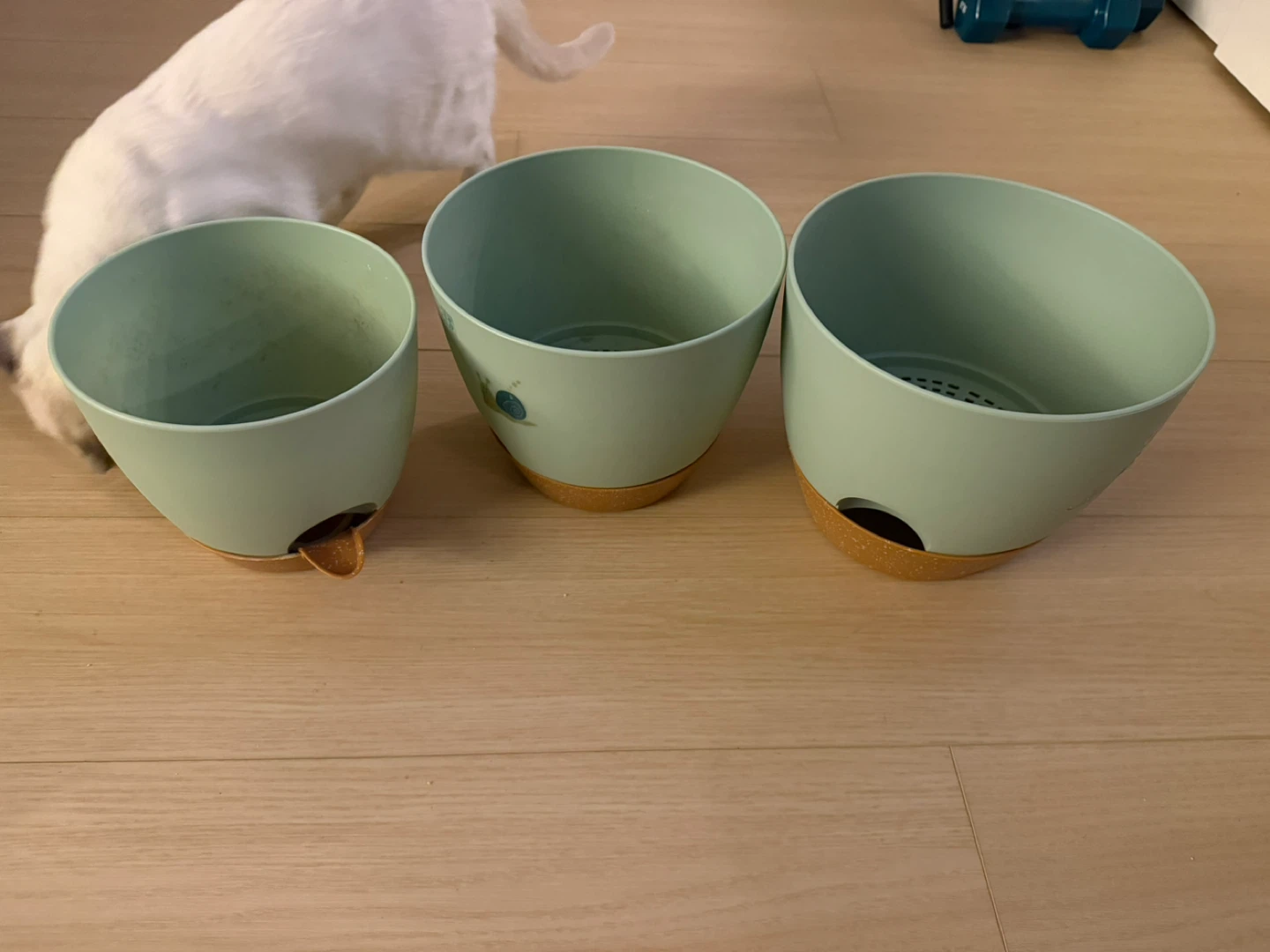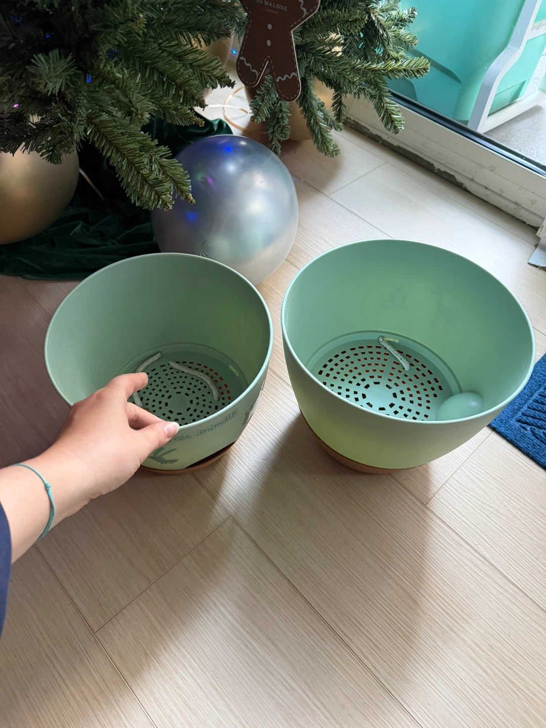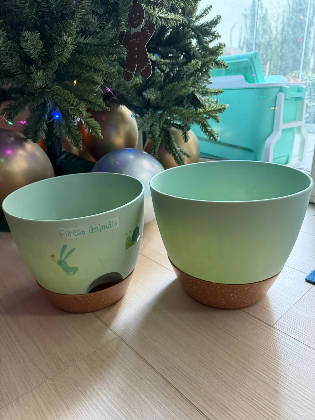 I have a set of three self-watering planters, each adorned with a cute 'Forest Animals' design, both on the bigger side! For medium-size plants. They're in great condition and ready to bring some mint/sage green into your space. Perfect for anyone who loves plants but sometimes forgets to water them!