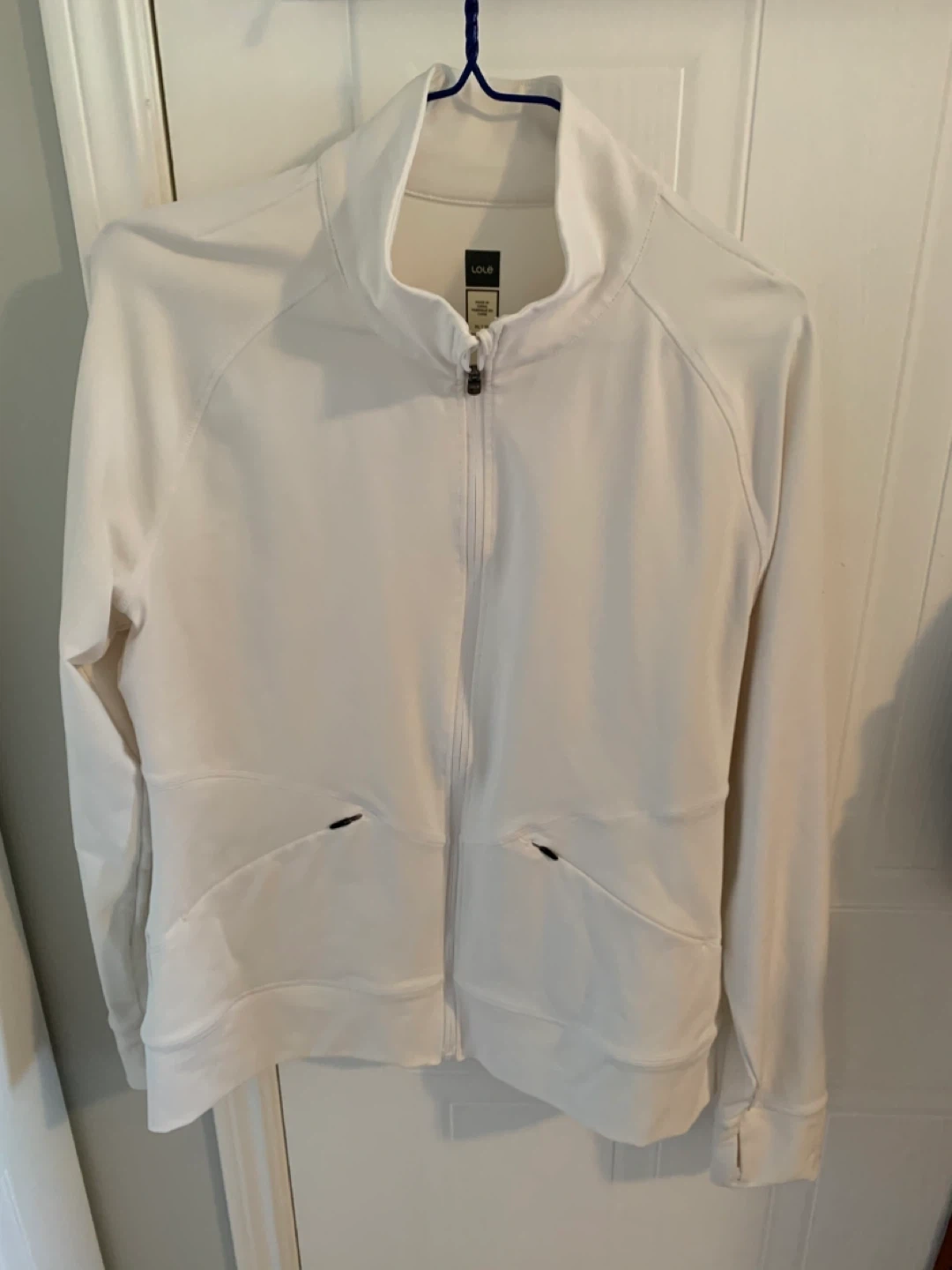This is a Lole white full zip jacket in size L. It has a full zipper closure and two front pockets. Like new.