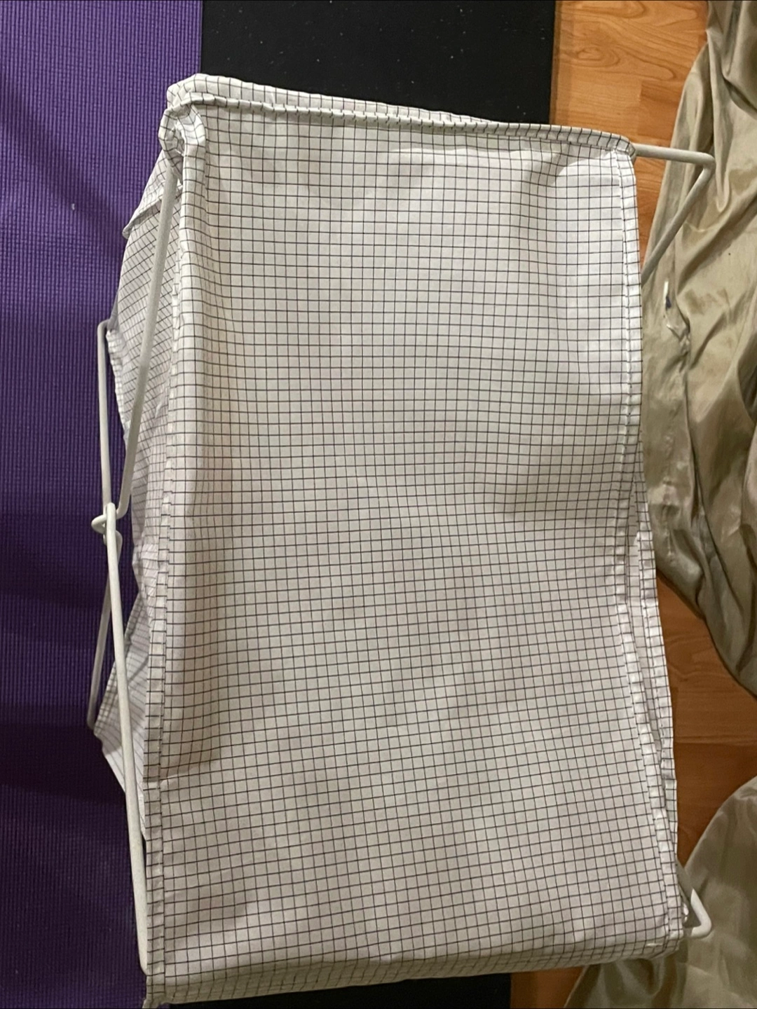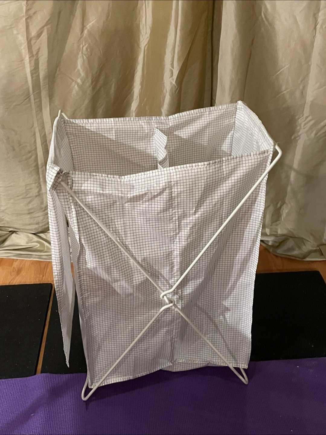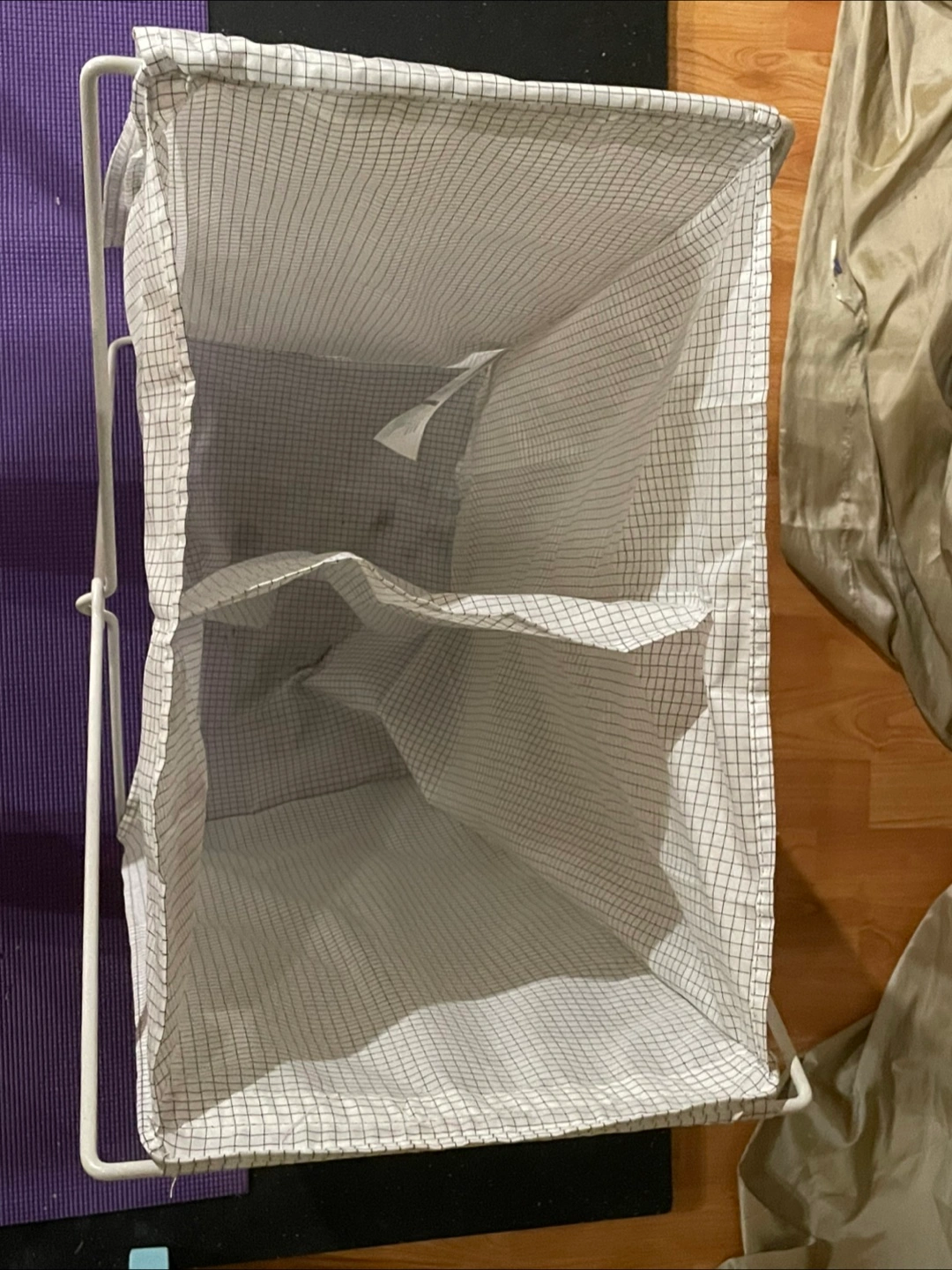 A laundry hamper with a grid pattern. It has a foldable, metal frame. Useful for keeping your laundry organized and your space tidy. Has two compartments to sort your laundry