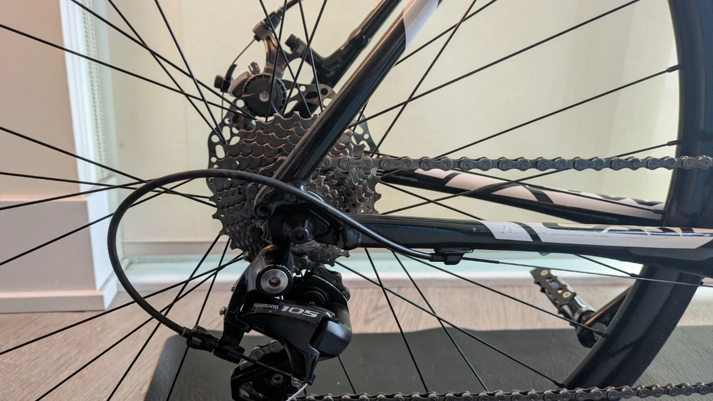 This is a Cannondale CAAD X road bike with aluminum frame. It features Shimano 105 components (groupset and breaks), mechanical discs and a FSA Gossamer crankarm. It has Madux CX 3.0 Disc wheels with Continental Gatorskin tires. It's a size 51 frame.
