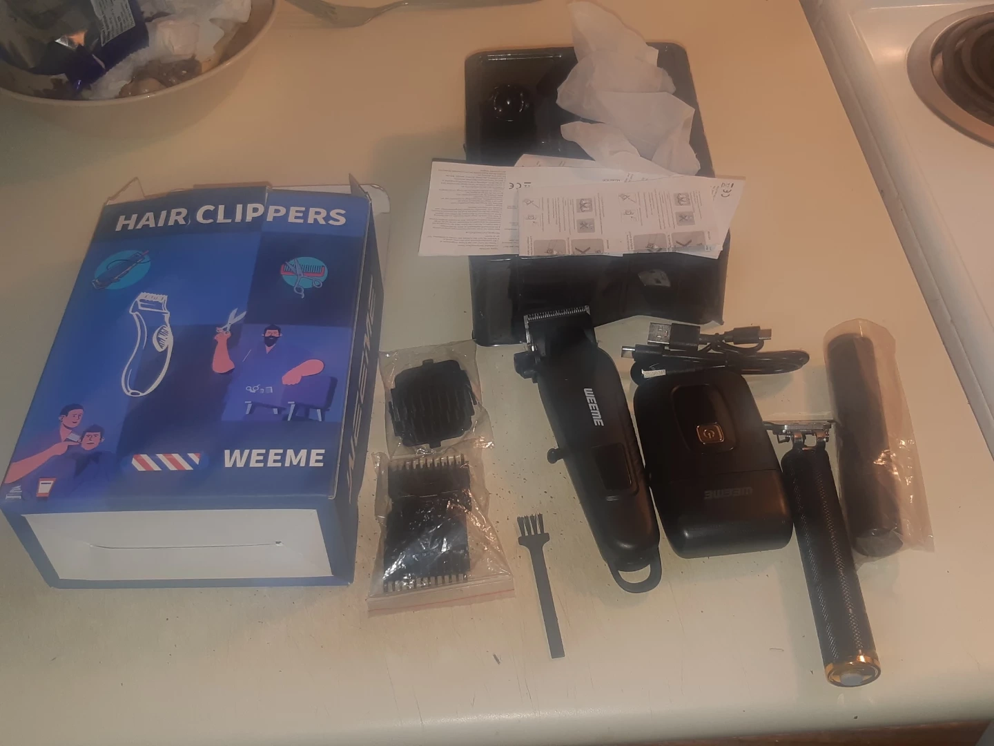 This set includes a WEEME hair clipper and a smaller detail trimmer. It comes with multiple comb attachments and a cleaning brush. Rechargeable with USB cable.