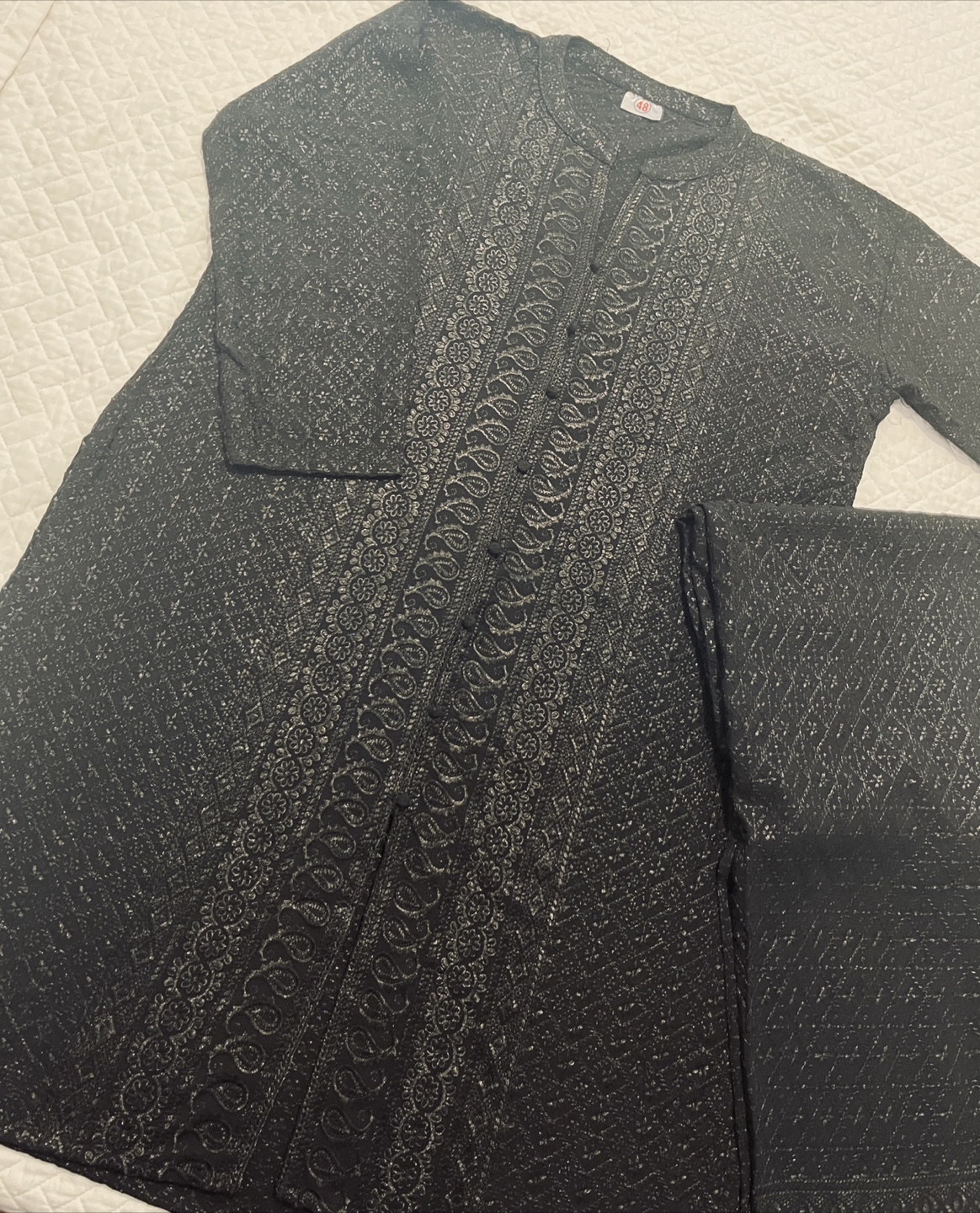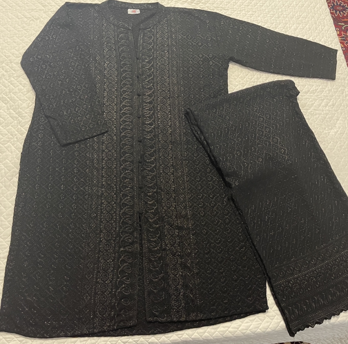 Beautiful black shalwar kameez with intricate embroidery. Perfect for special occasions or everyday wear! The set includes a long tunic (kameez) and matching pants (shalwar).