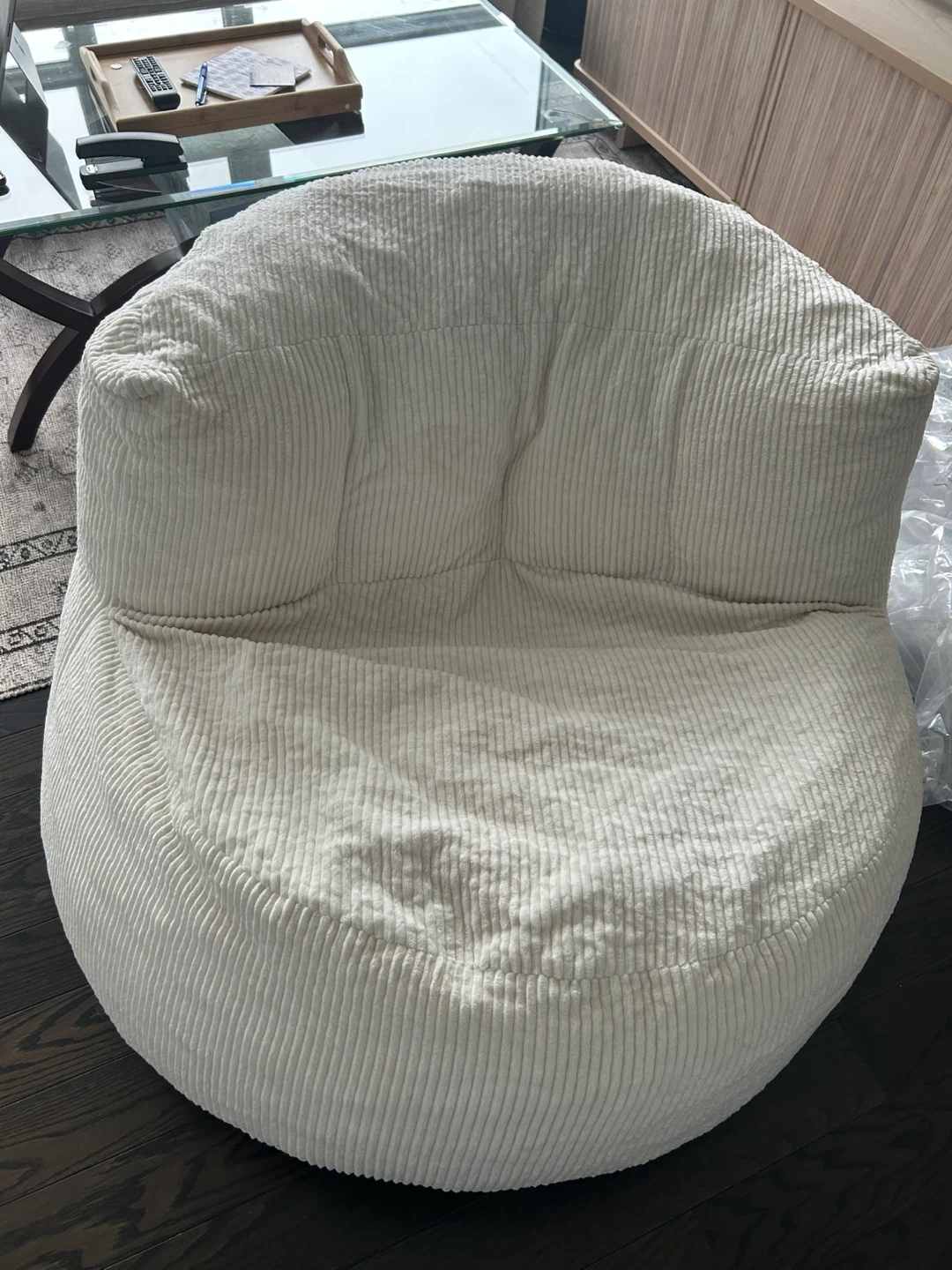 This is a comfy bean bag chair with a soft white corduroy exterior. It's perfect for lounging, reading, or playing games. The material is durable and the design is classic.