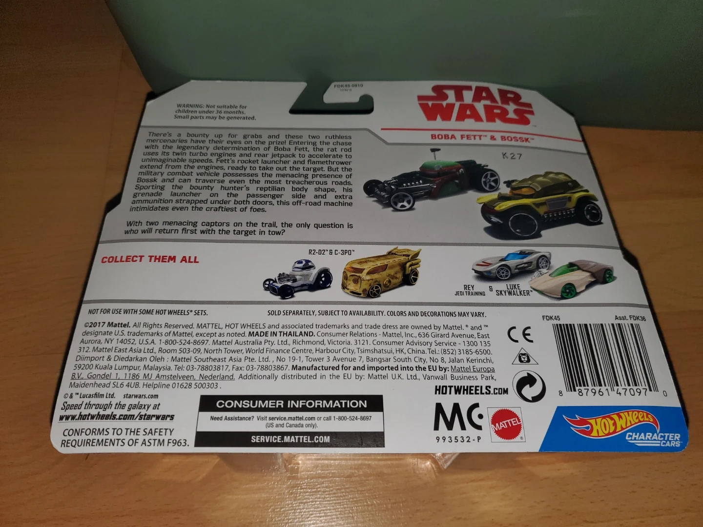 This Hot Wheels set includes two character cars from Star Wars: Boba Fett and Bossk. These die-cast vehicles are inspired by the iconic characters. Great for Star Wars fans and collectors!