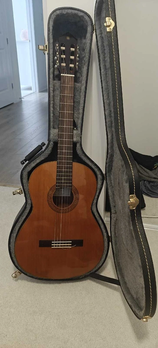 This is a Yamaha CG142C classical guitar, providing a rich, resonant tone ideal for both beginners and experienced players. The guitar is in good condition and has been well-maintained, making it a reliable instrument for any musician. Additional specs include: Spruce top, Rosewood back and sides, Nato neck, Rosewood fingerboard, Classical tuners. If the ad's still up, the guitar's still available!