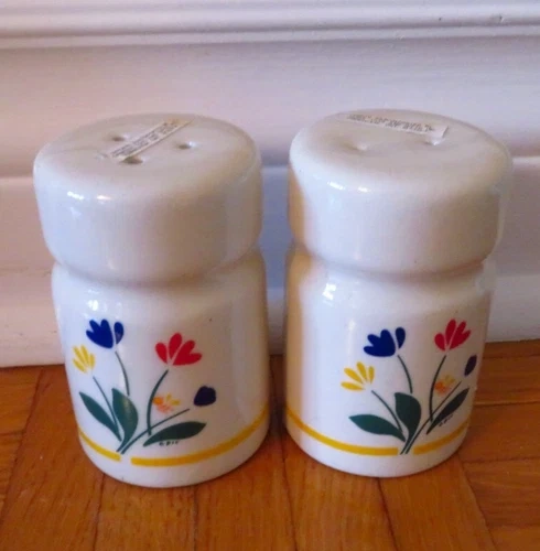 Enhance your kitchen's charm with this vintage 1980 salt and pepper set, featuring a delightful tulip and flowers design. Crafted from high-quality ceramic, the shakers exude a timeless elegance that is sure to be a conversation starter at any gathering. The classic white color complements any table setting, making it a versatile addition to your dining ensemble. While the brand is not explicitly stated as Marimekko, the unique style and craftsmanship suggest a piece with a similar aesthetic. The intricate detailing and durable material make this set a practical and stylish choice for both daily use and special occasions. Add a touch of vintage flair to your kitchen with these lovely ceramic shakers.