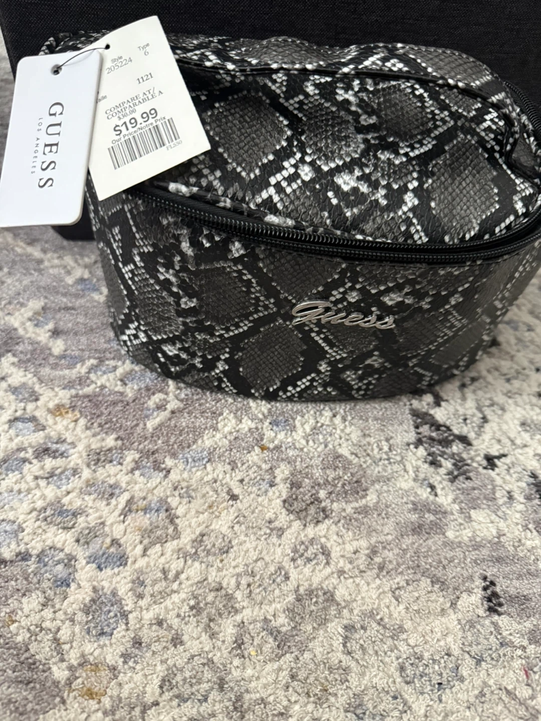 *Brand new, tags on* This is a black and grey snake print cosmetic bag from Guess. It's made with a durable padded material and features a zippered closure.