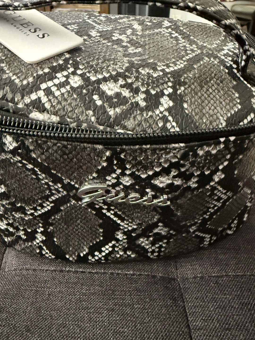 *Brand new, tags on* This is a black and grey snake print cosmetic bag from Guess. It's made with a durable padded material and features a zippered closure.