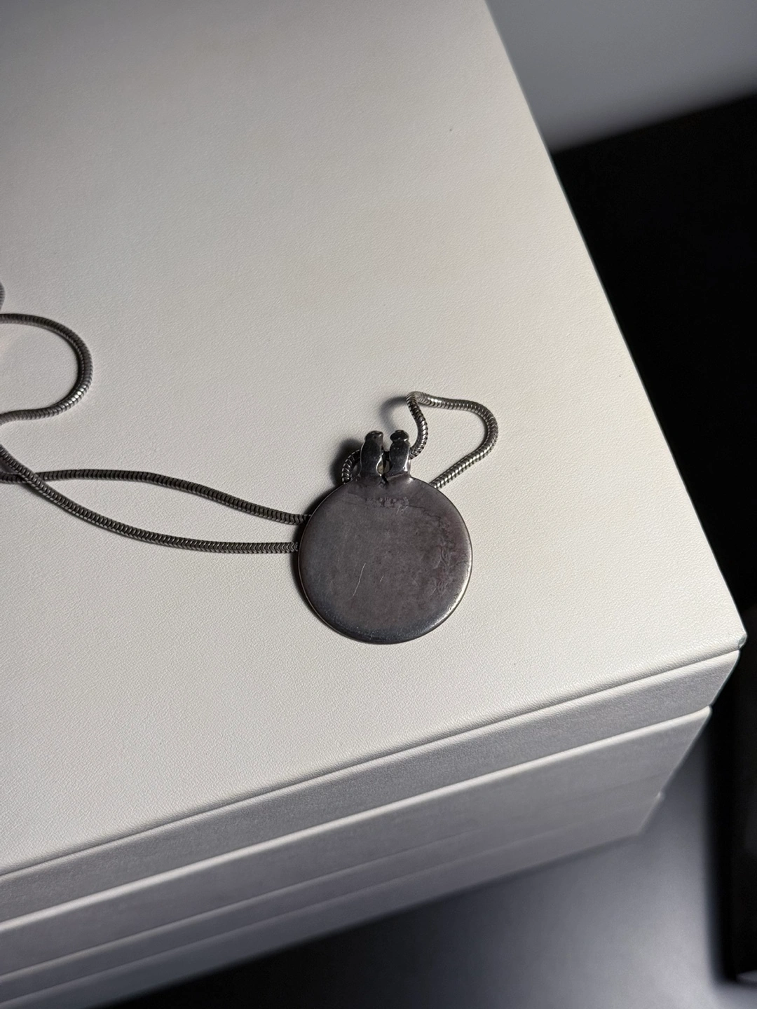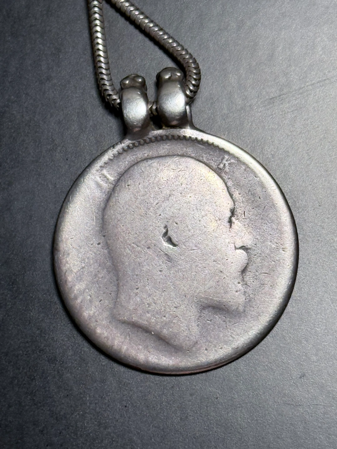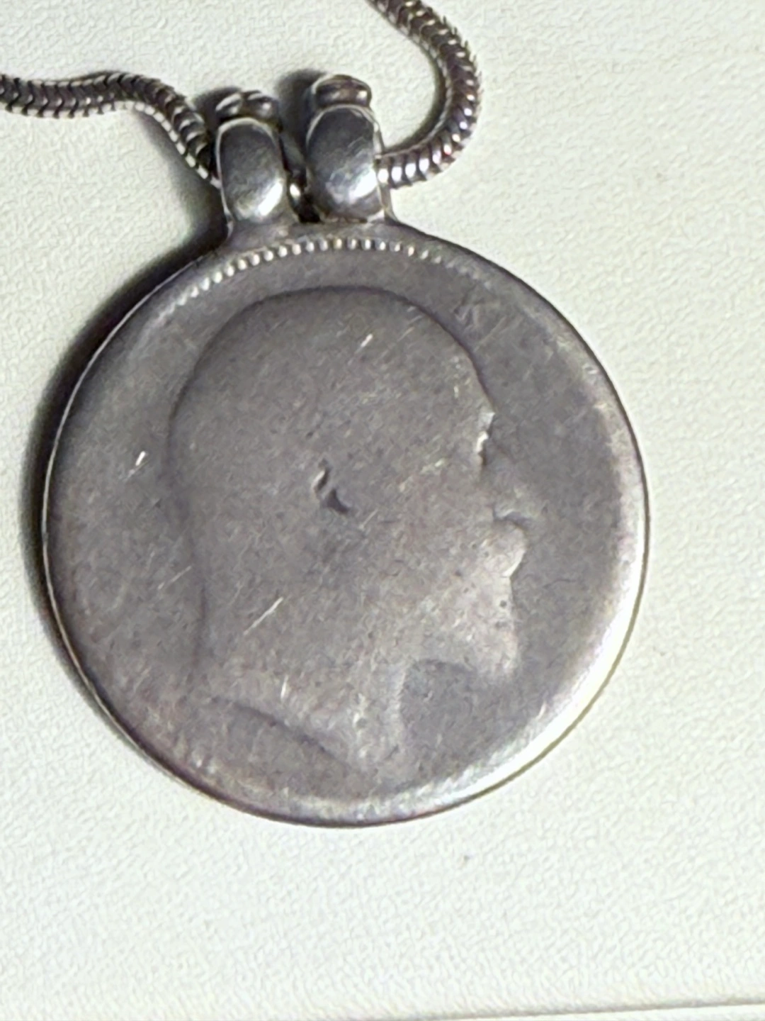 Selling a sterling silver vintage coin pendant necklace. The pendant features a profile of a man on one side, giving it a unique and historical look. The chain is a delicate snake chain, complementing the pendant nicely. It's a great piece for adding a touch of vintage charm to any outfit