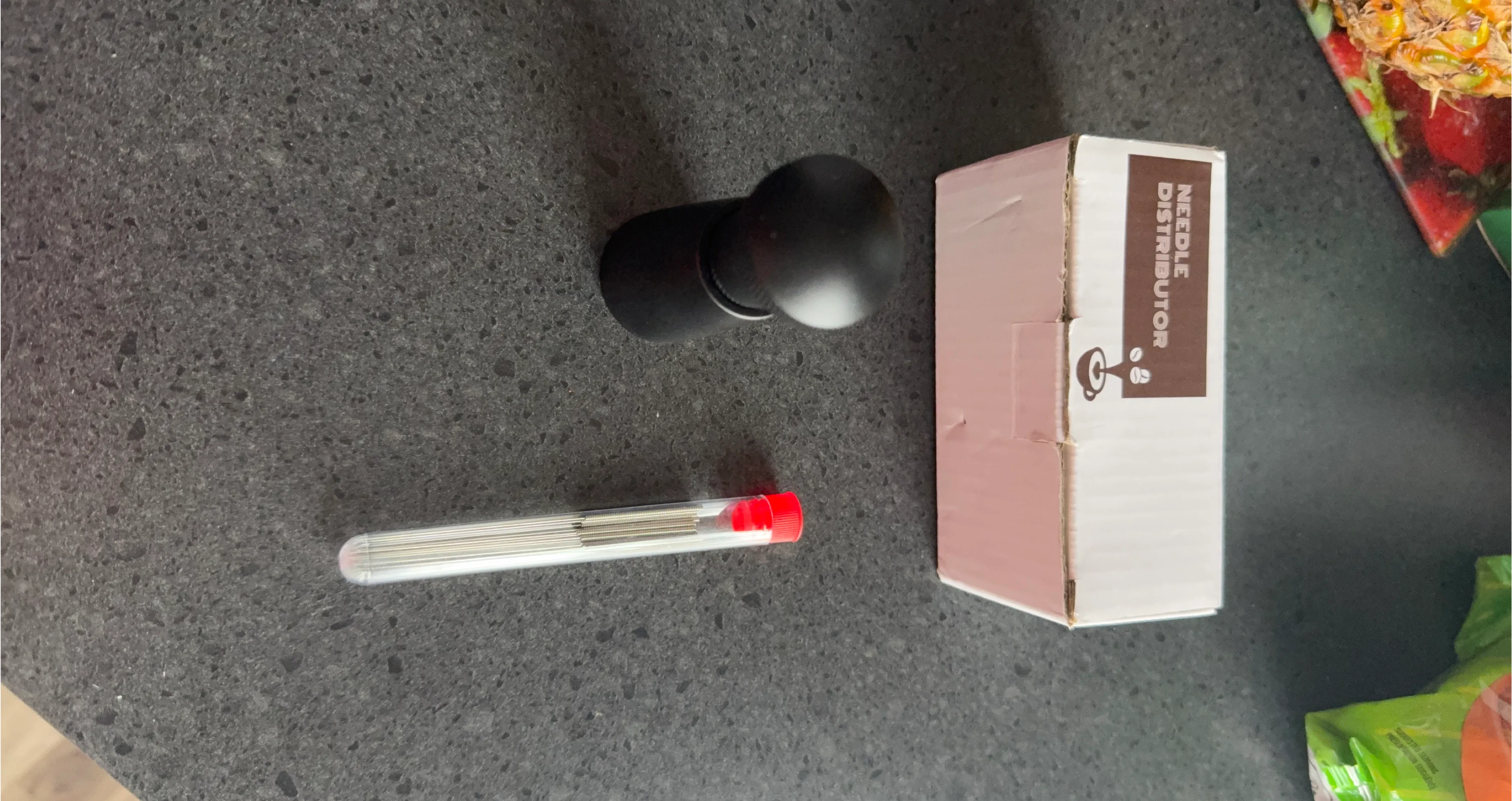 I'm selling a coffee needle distributor tool. It comes with the original box and a tube of needles. This tool is designed to evenly distribute coffee grounds in your portafilter for a better extraction