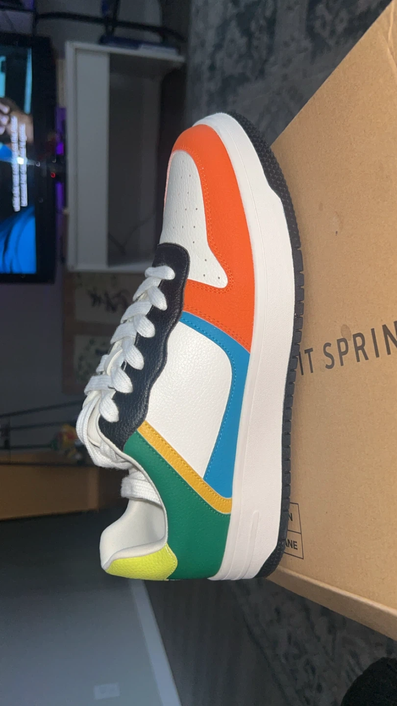 These trendy platform sneakers feature a vibrant mix of orange, green, blue, yellow, and black panels. They're crafted from a leather-like material with a sturdy rubber sole. The shoes come with extra white laces and are in their original box. Perfect for adding a pop of colour to any casual outfit!