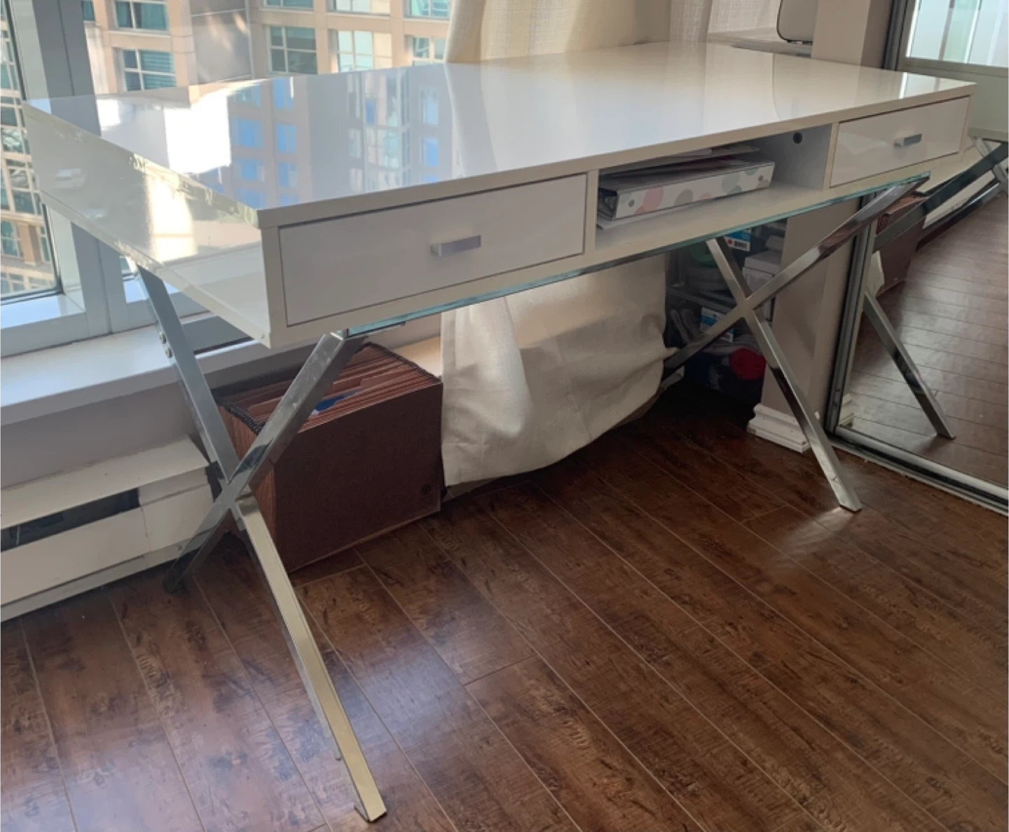 This sleek white desk features a high-gloss finish and sturdy chrome legs. It includes two drawers and an open shelf for storage. Perfect for a home office or study space.