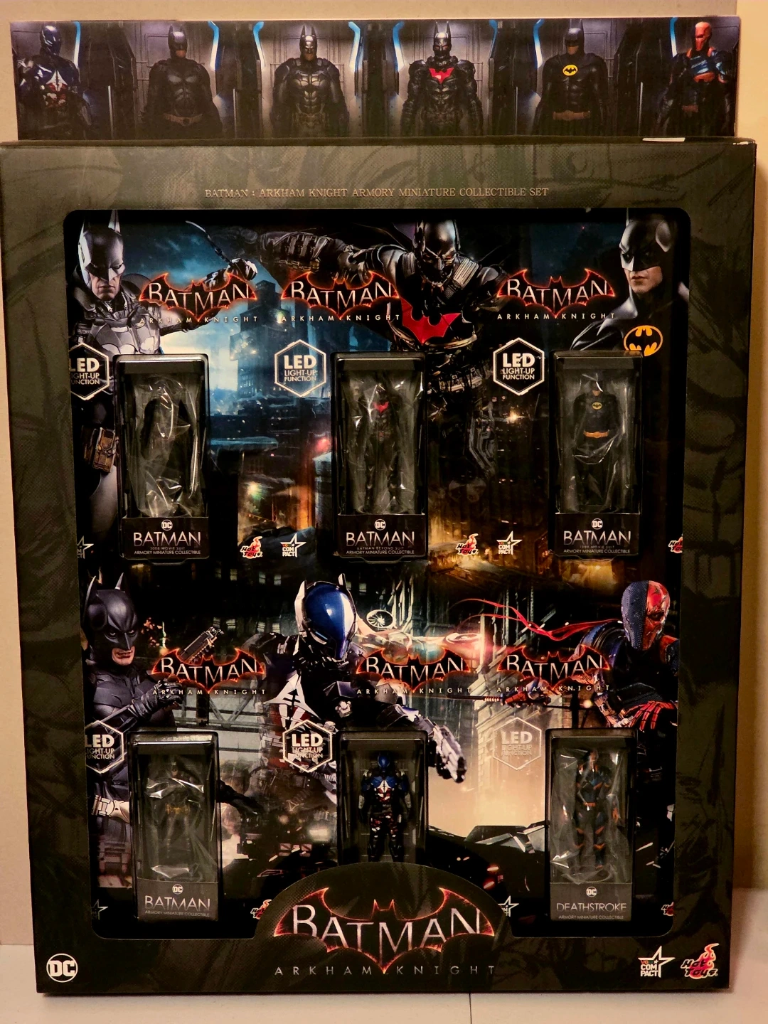 This set features multiple Batman figures from the Arkham Knight game. It includes an LED light-up function. Recommended for ages 15 and up. Hot Toys Batman Arkham Knight Armory Miniature figures collection